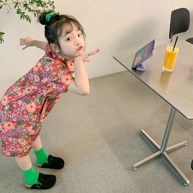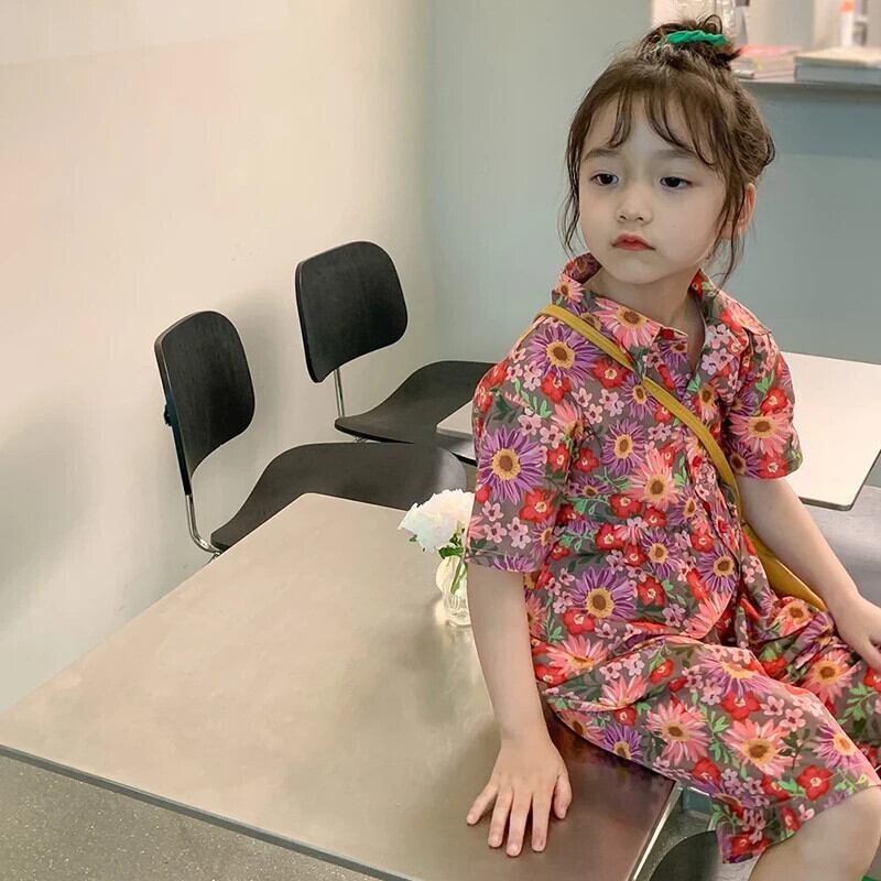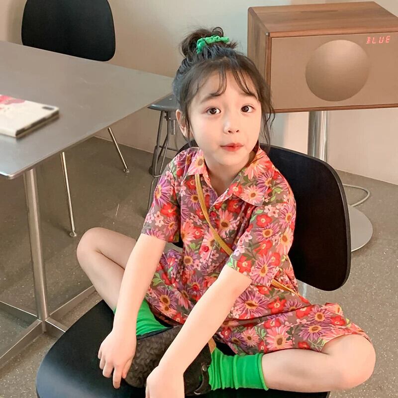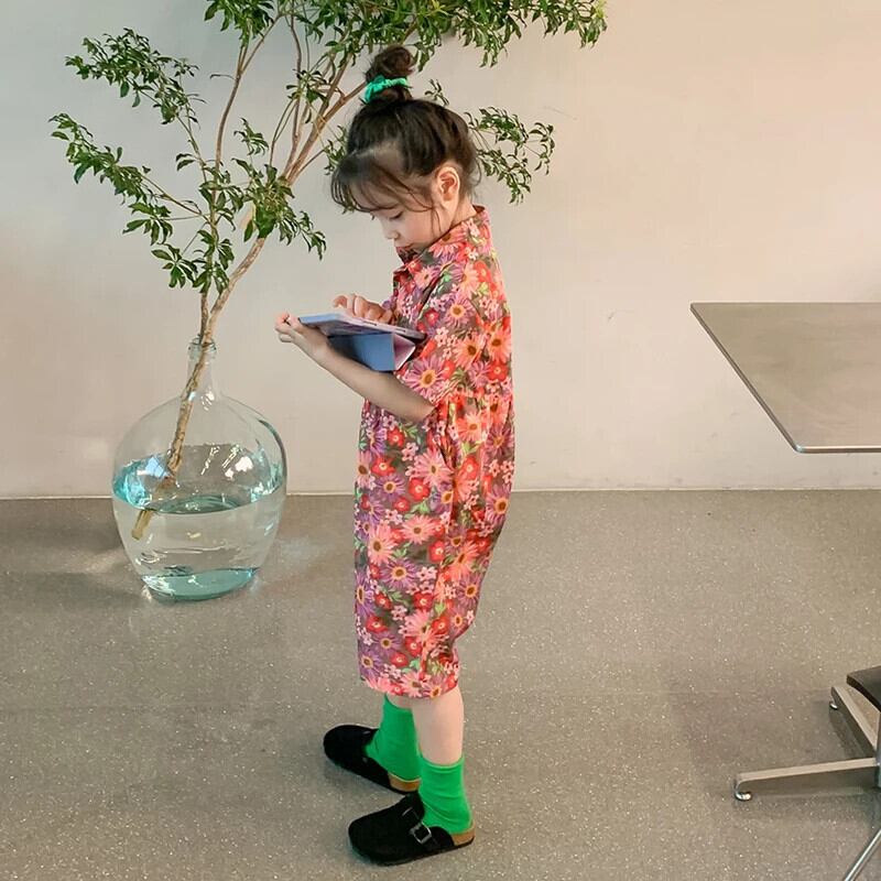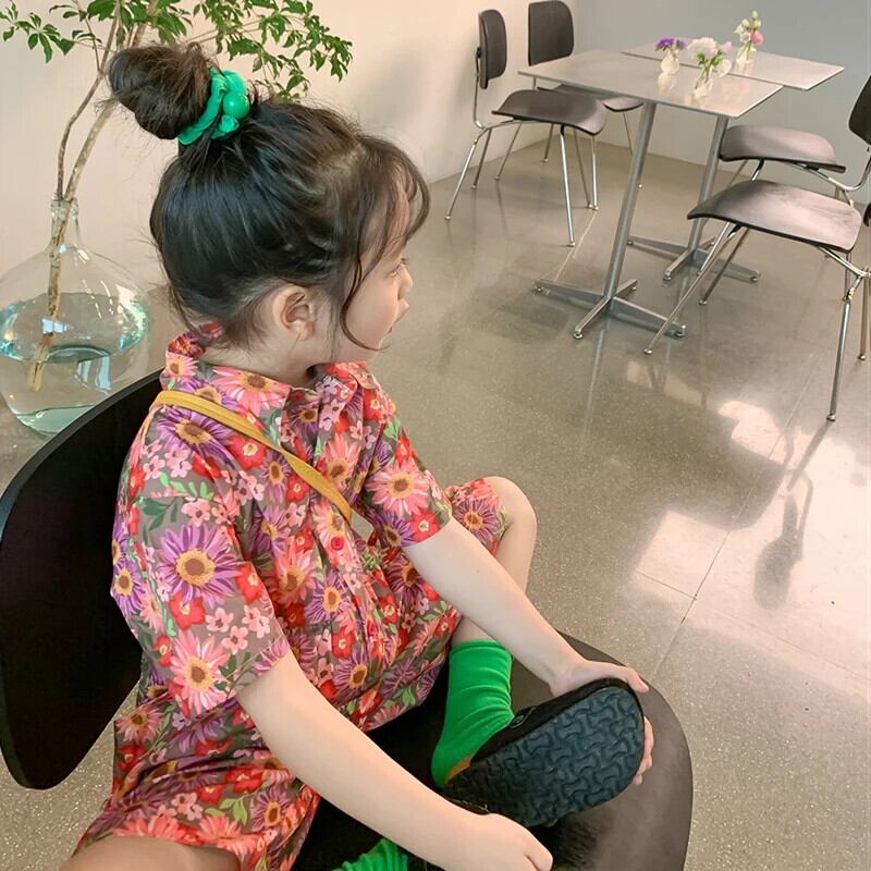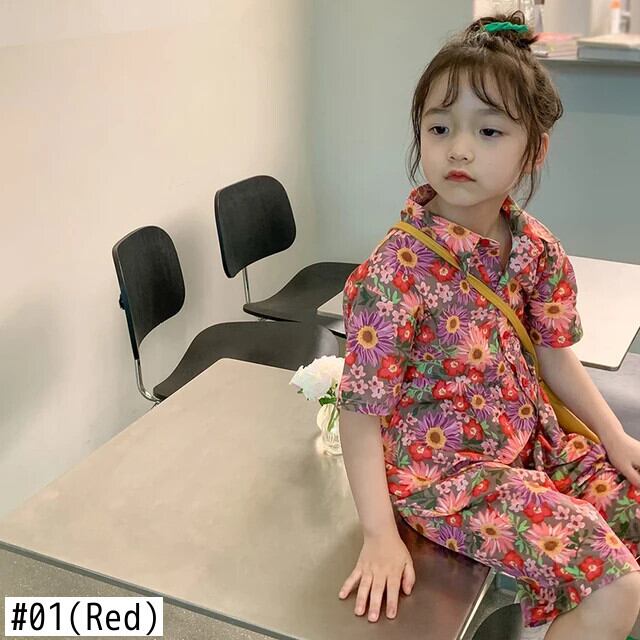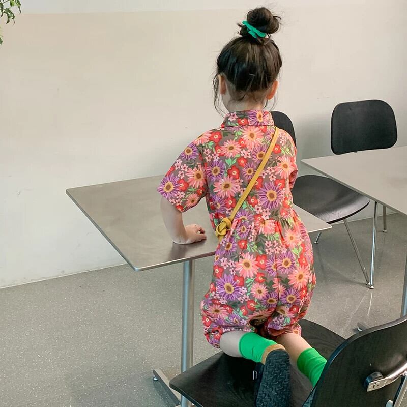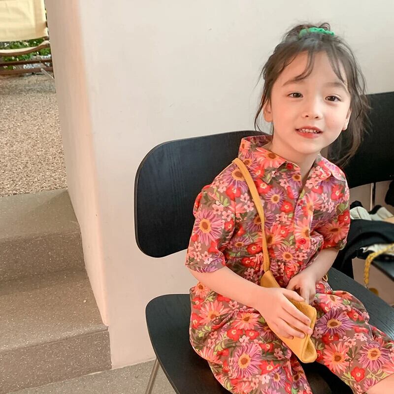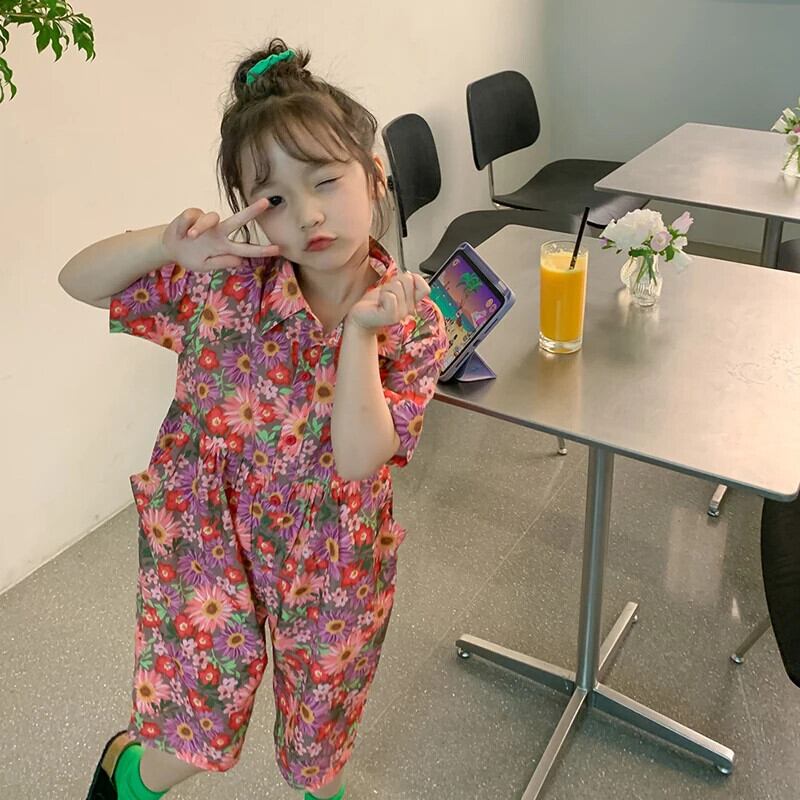子供女子パンツシャツ襟花プリントジャンプスーツ子供夏ルーズガールかわいいズボンパンツ 3-8 年 大人ガーリー スウィート キュート カジュアル サマー 夏物 キッズ フラワーデザイン