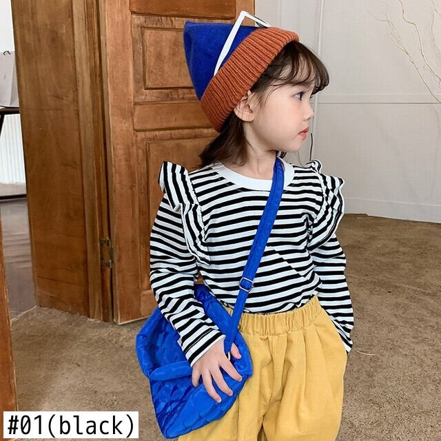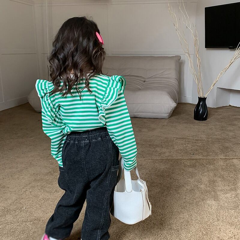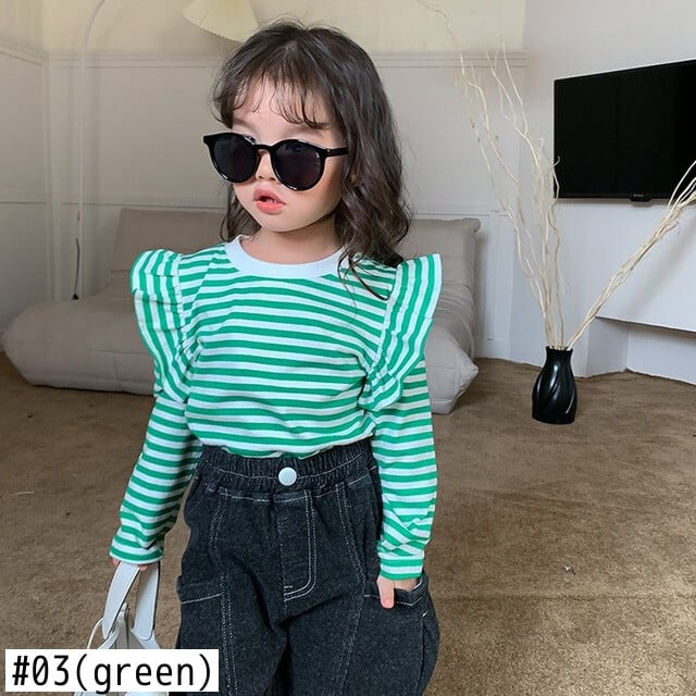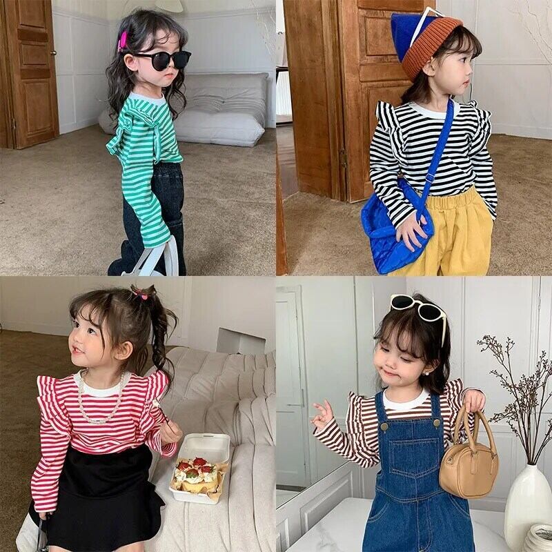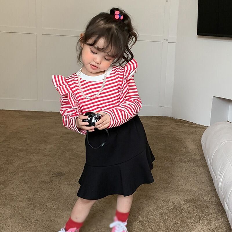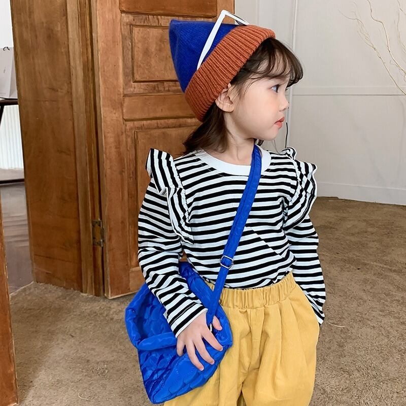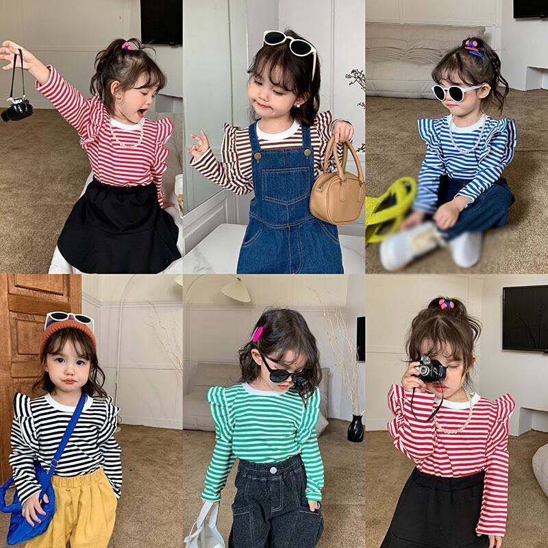 キッズガールズストライプ Tシャツ長袖秋幼児女赤ちゃんフライングスリーブトップ底入れシャツプルオーバー ロング オータム 秋物