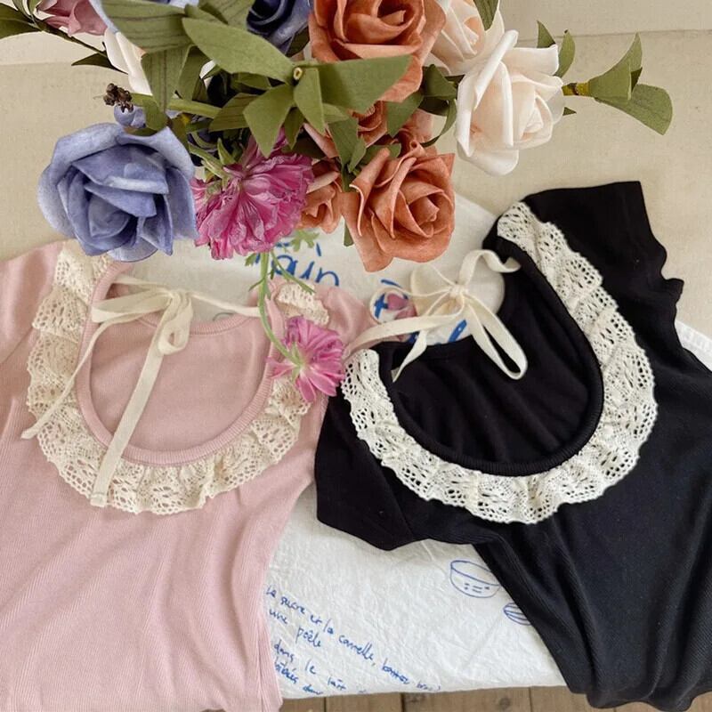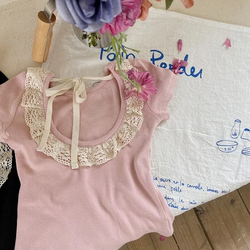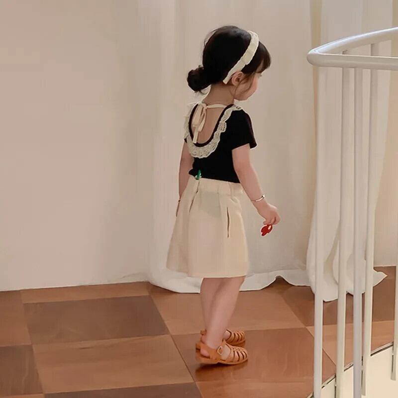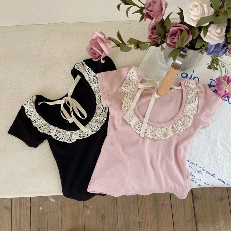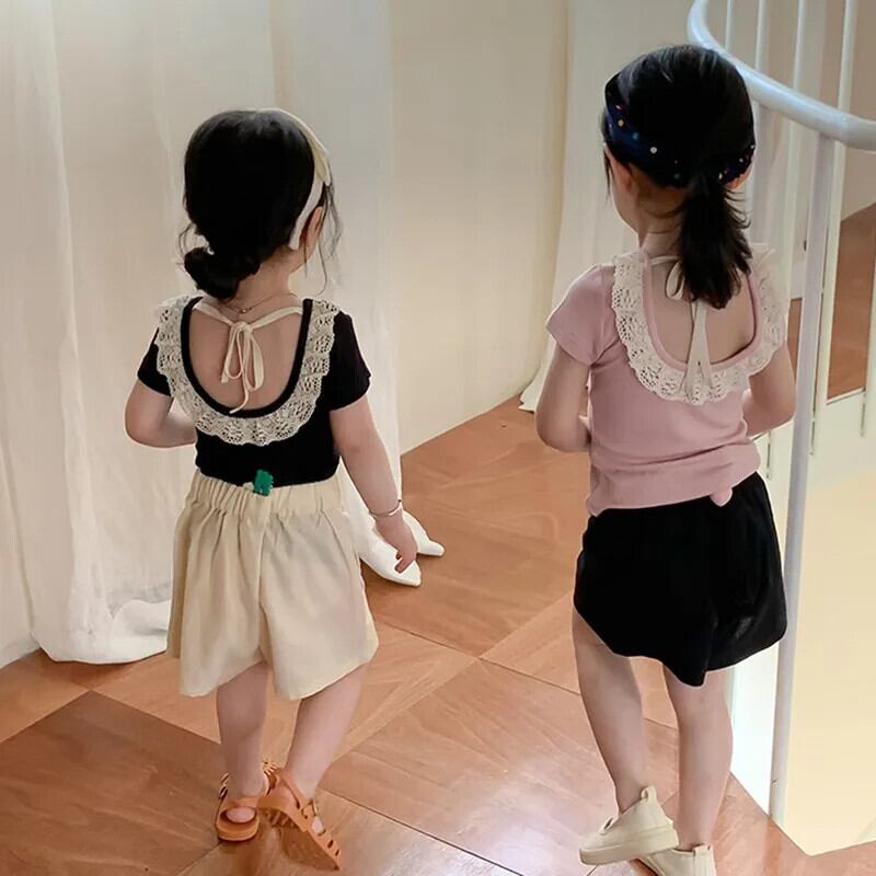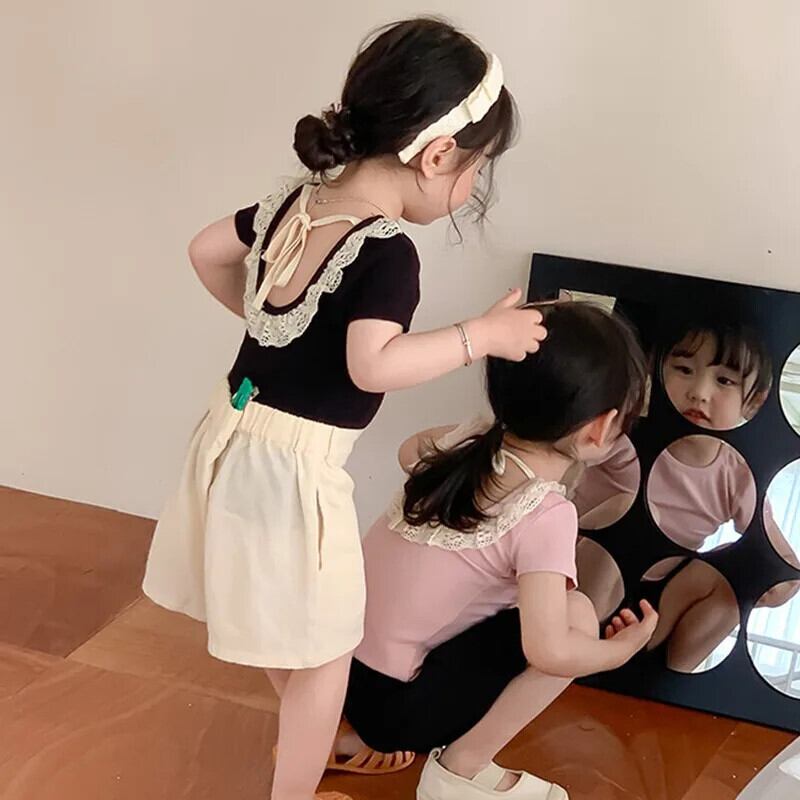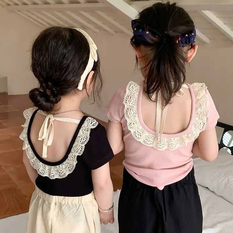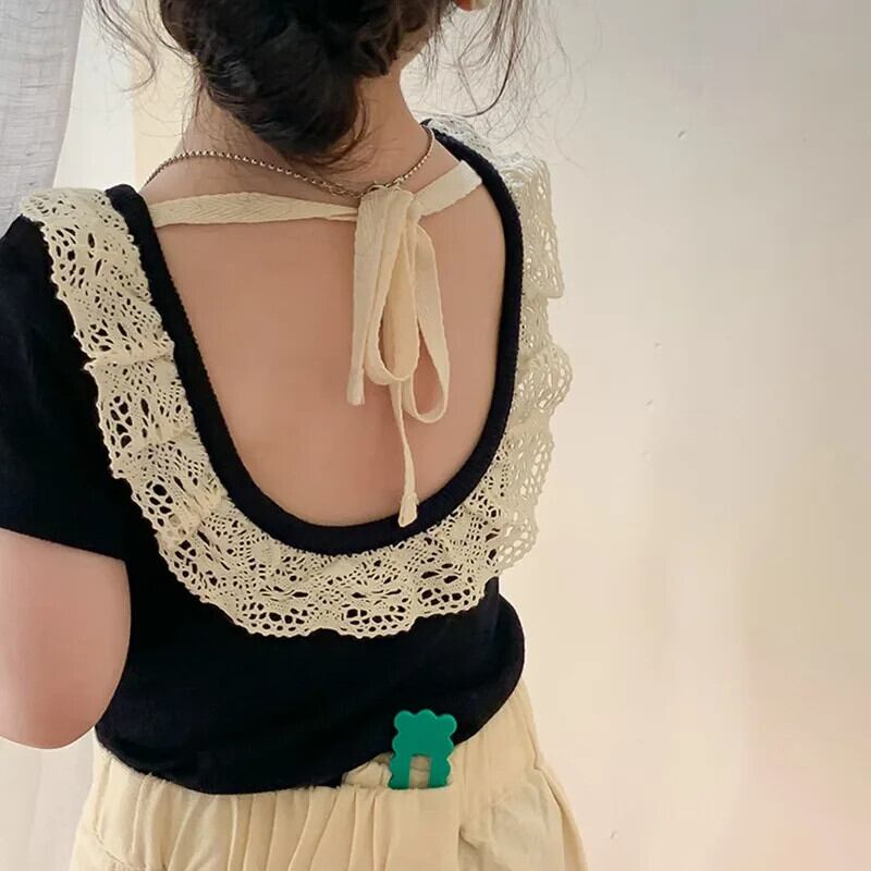 夏女子 Tシャツオープンバックレース子供ベビーかわいい半袖トップキッズベビー女子底トップス 大人ガーリー スウィート キュート カジュアル サマー 夏物 ソリッドカラー