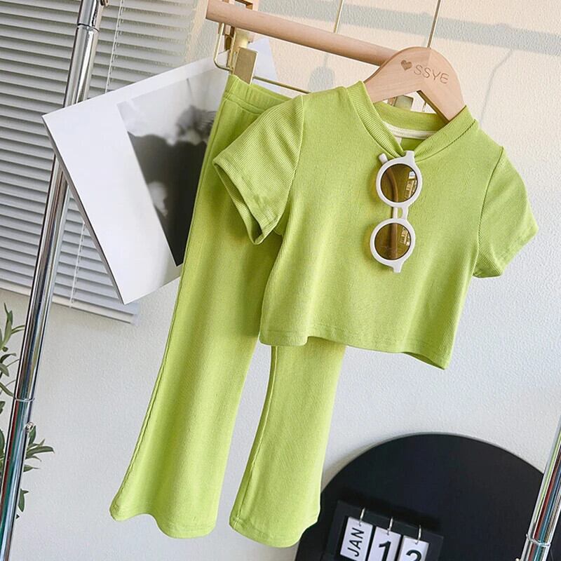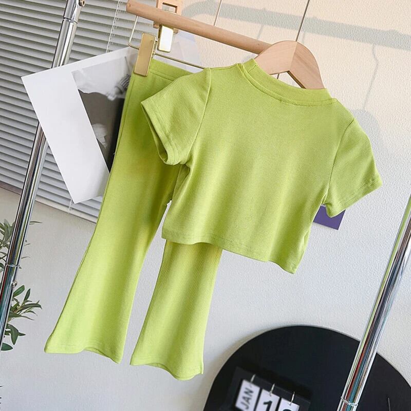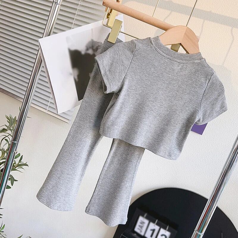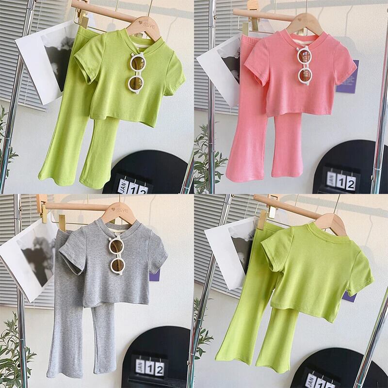 夏 3-9 歳子供女子セットスタイル半袖 Tシャツトップ + マイクロフレアロングパンツ子供トラックスーツ 2 個衣装セット ショート レッド ハーフスリーブ サマー 夏物 キッズ
