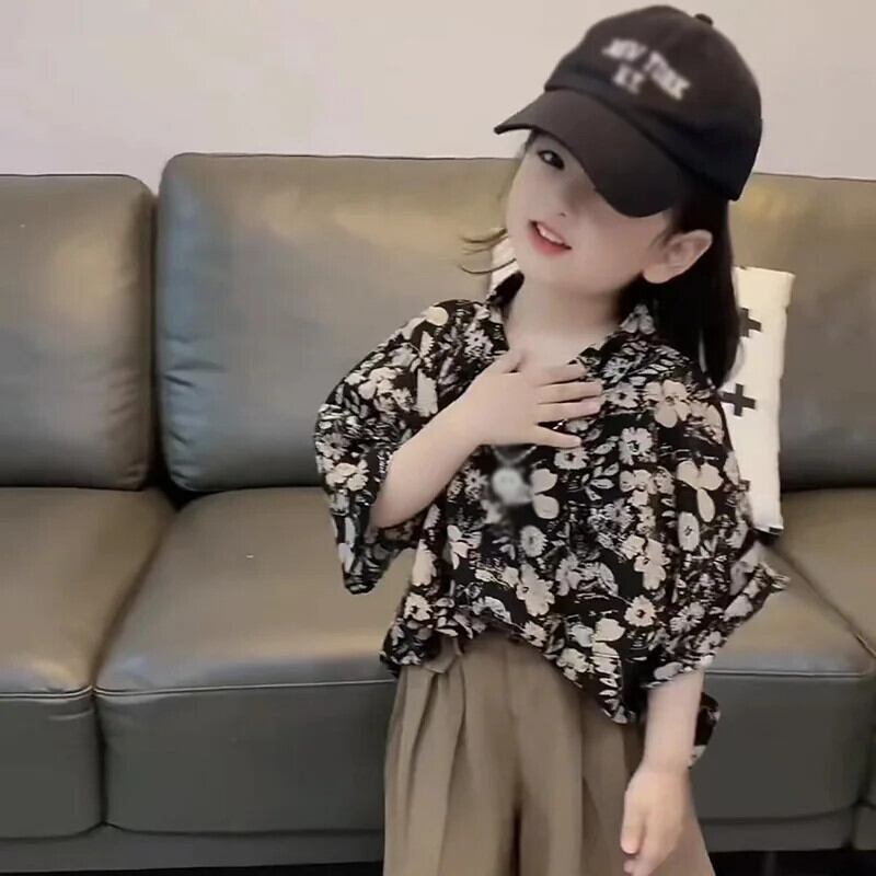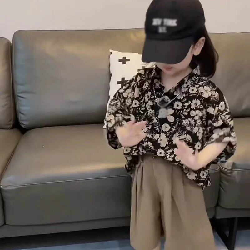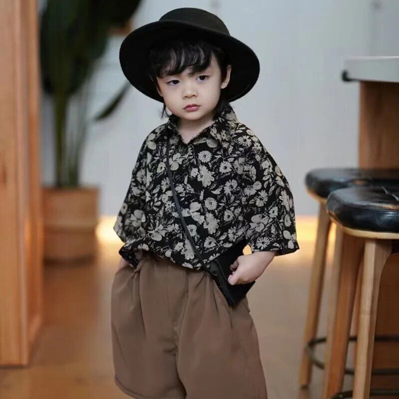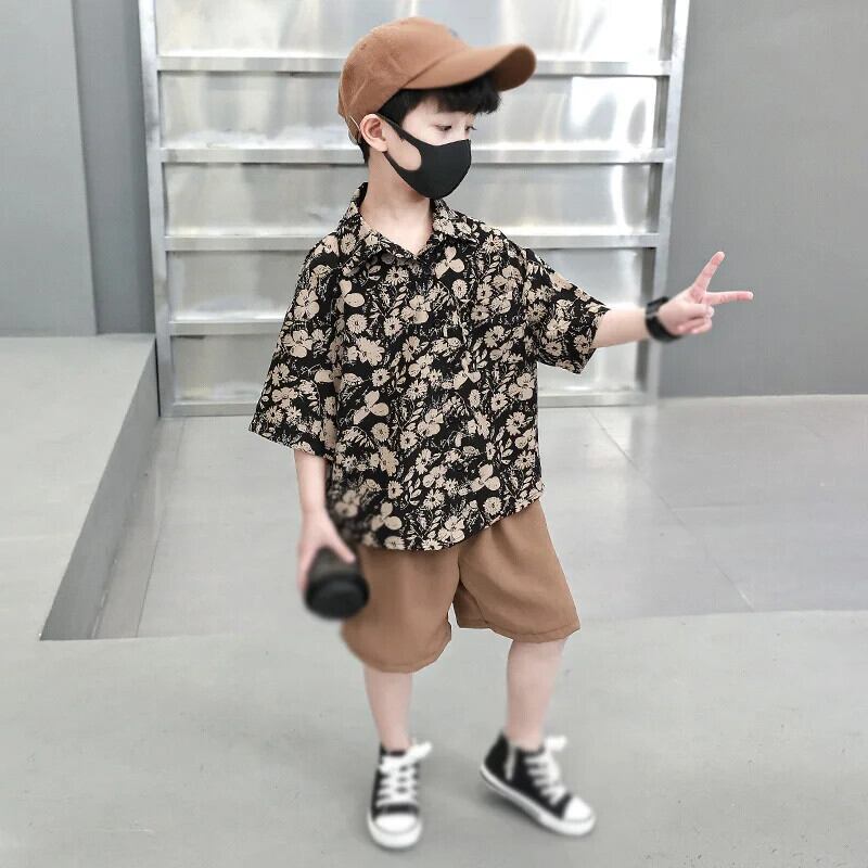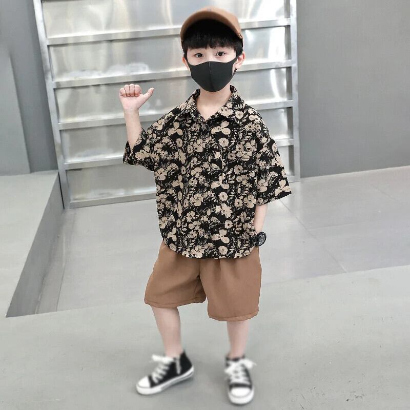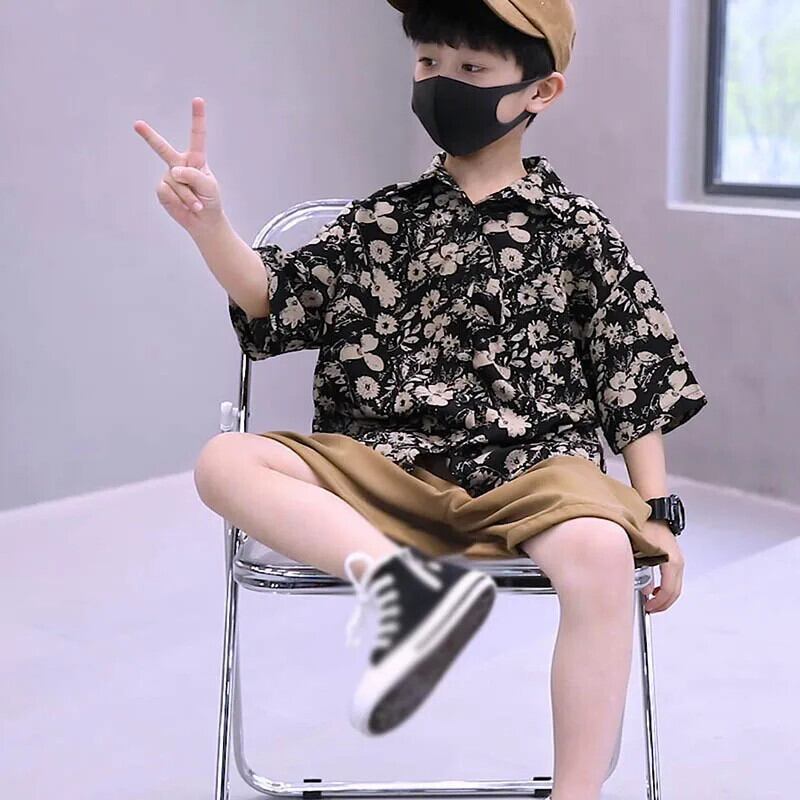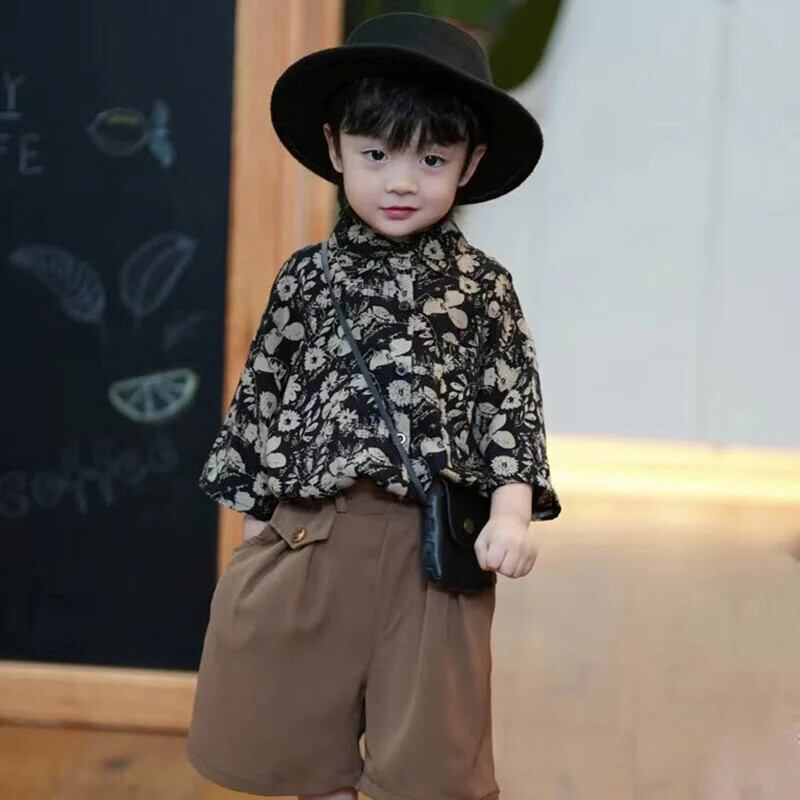 子供男子セット夏緩いレトロプリントラペル半袖トップソリッドカラーショーツ 2 個キッズボーイズ サマー 夏物 ブルマー
