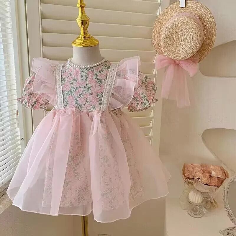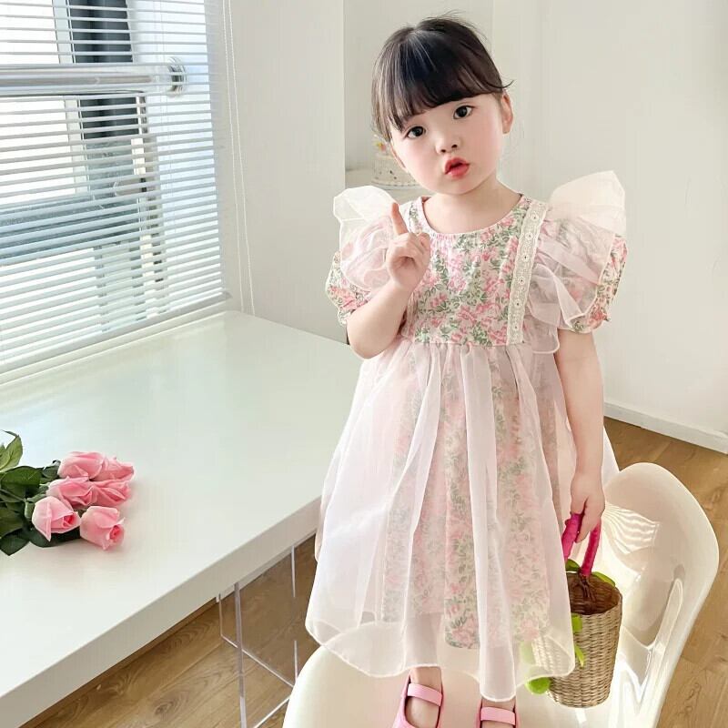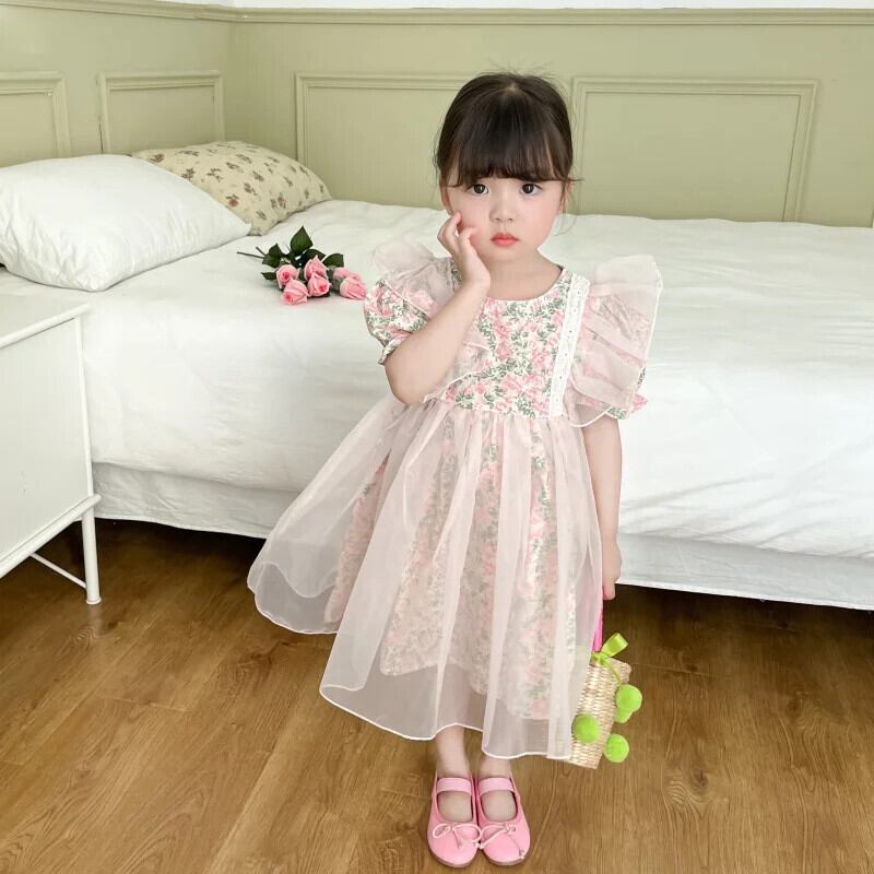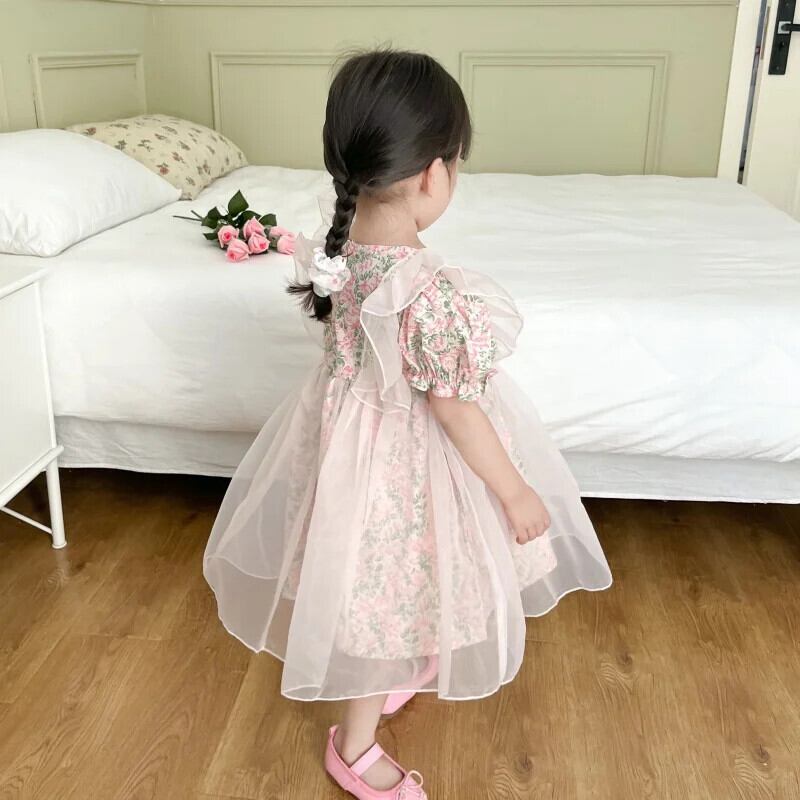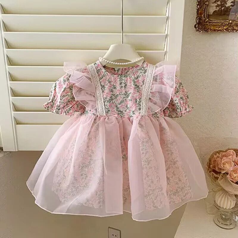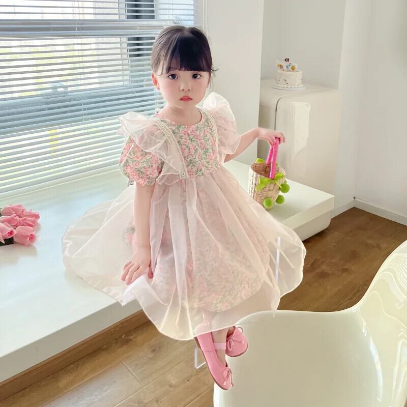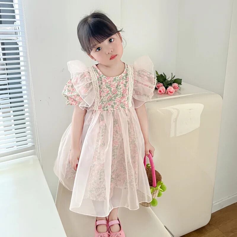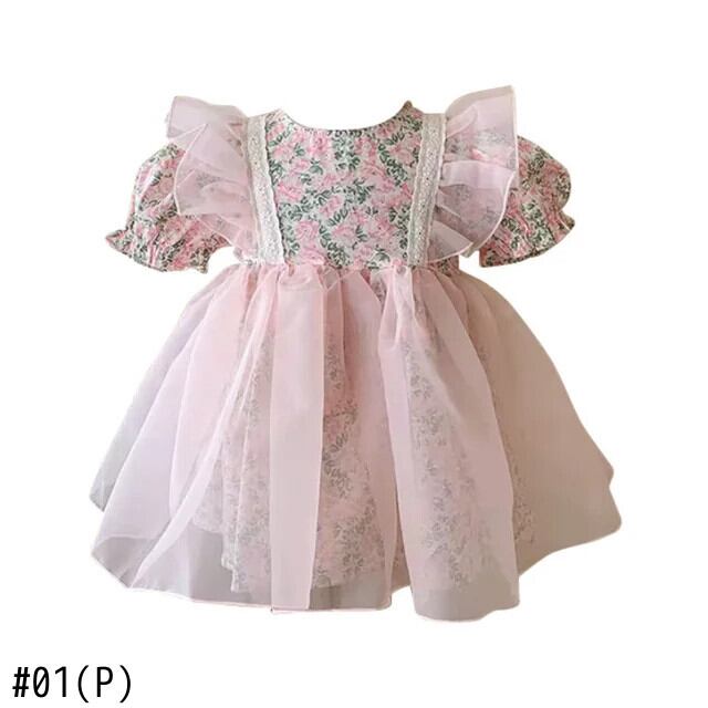 夏女子ドレス花バブルスリーブドレスキッズパーティー結婚式誕生日チュチュガウン子供 サマー 夏物 花柄 パニエ ペチコート