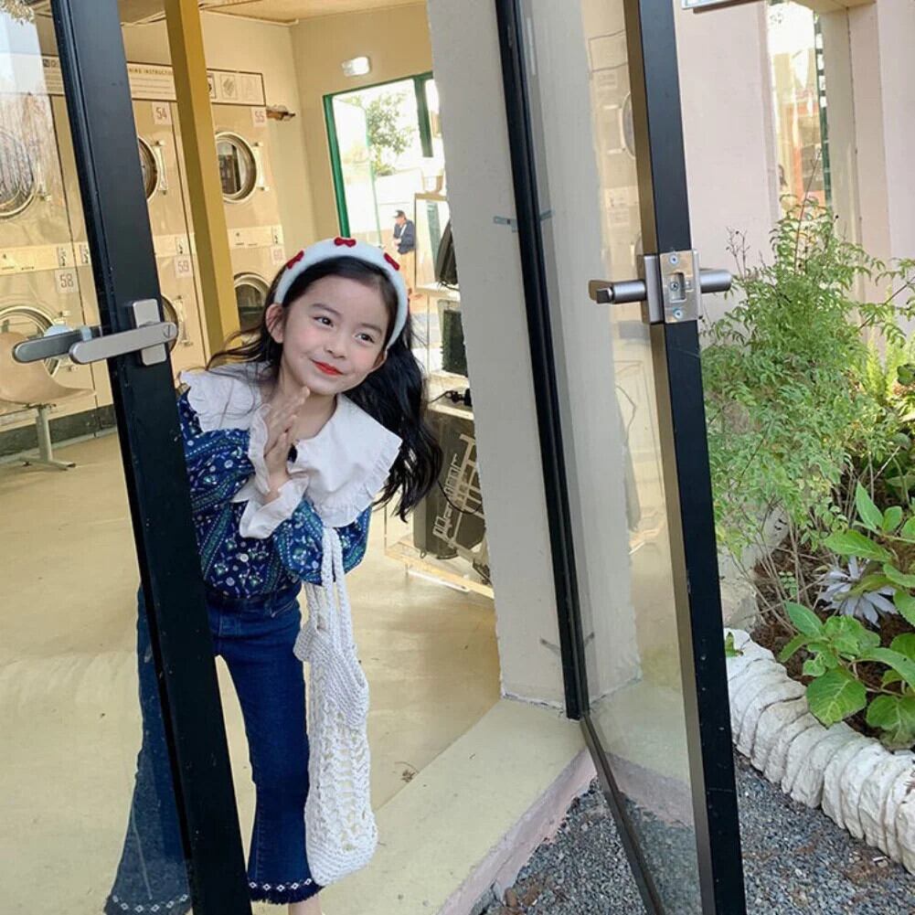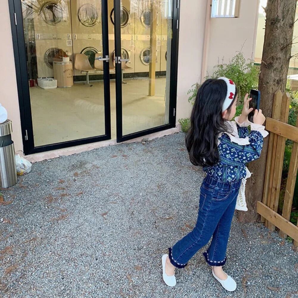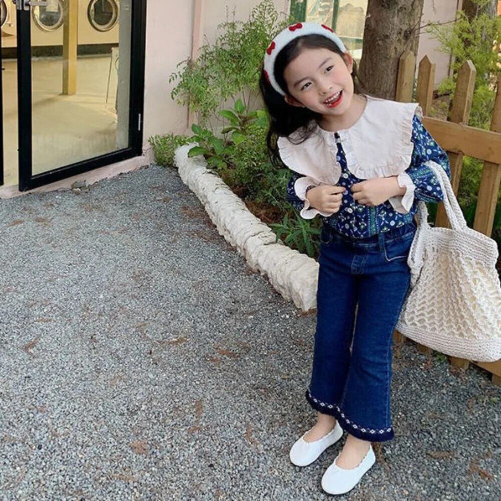 2 個子供女赤ちゃんセット秋ビッグラペル花柄シャツトップスフレアジーンズキッズガール衣装キッズガールスーツ レッド オータム 秋物