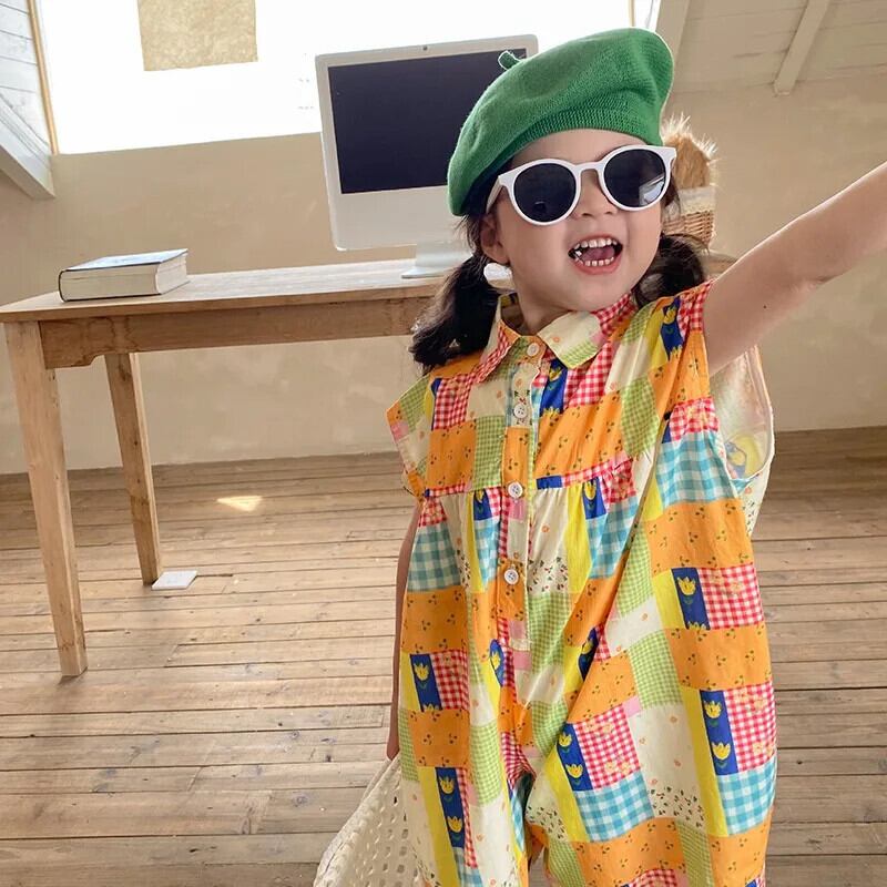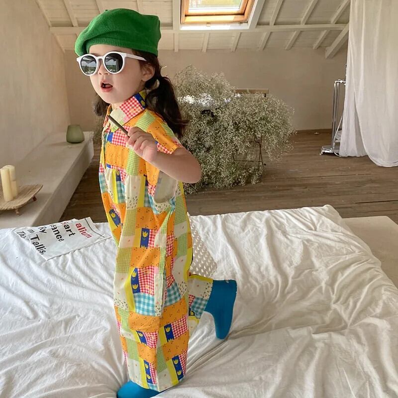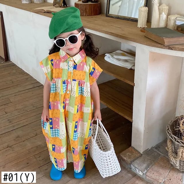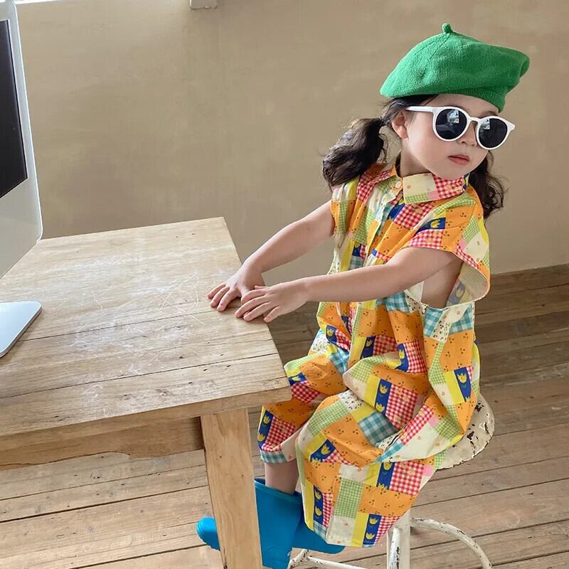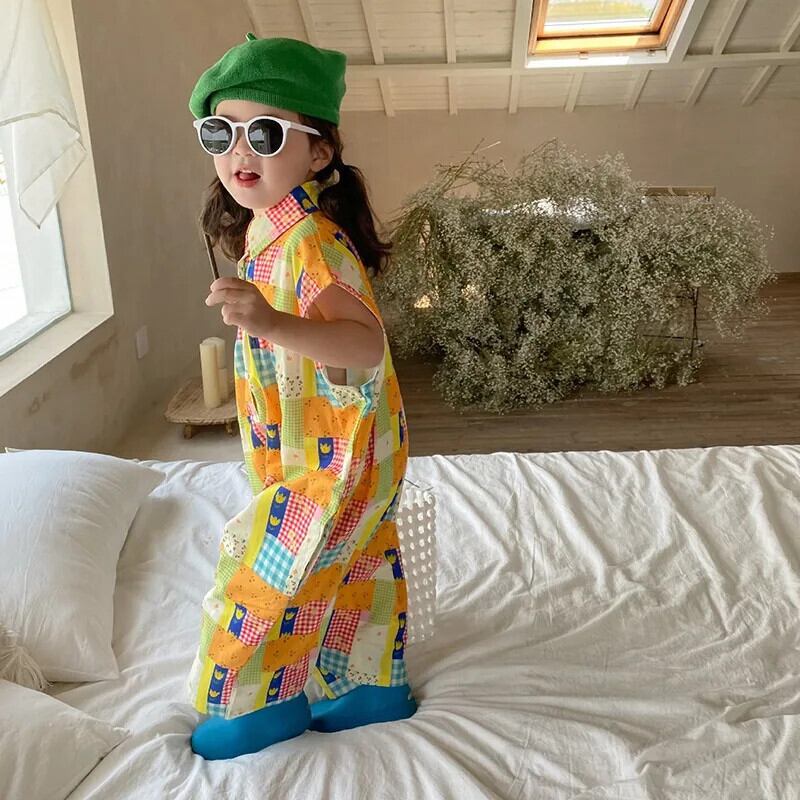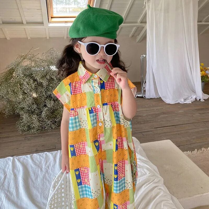 3-8years 子供女子夏ジャンプスーツ子供シャツ襟半袖ロンパースプリントジャンプスーツ & ロンパース & ロンパース & ロンパース & ロンパース & ジャンプスーツ & ロンパース ショート ロング ハーフスリーブ サマー 夏物 キッズ