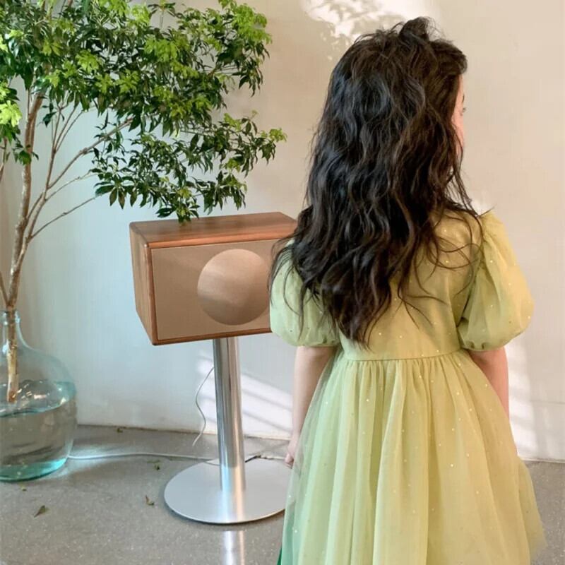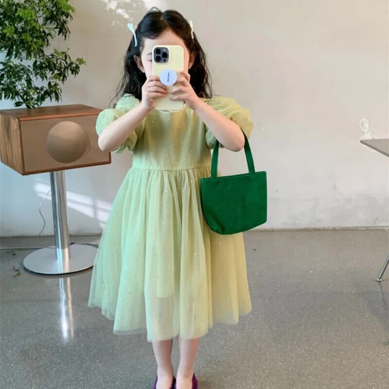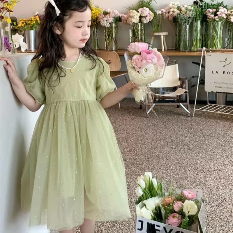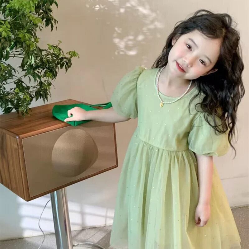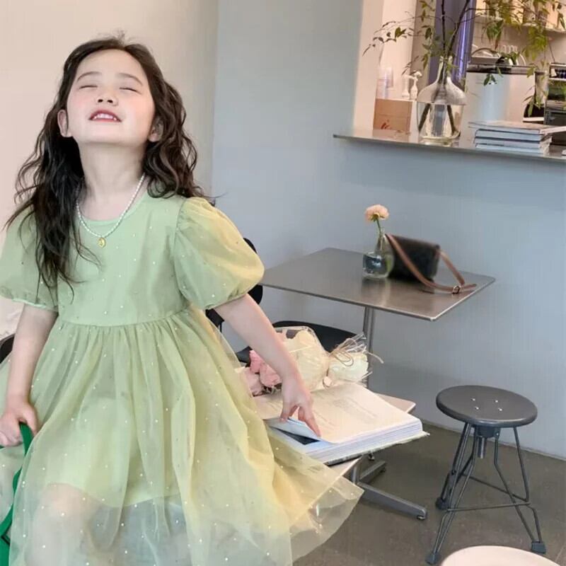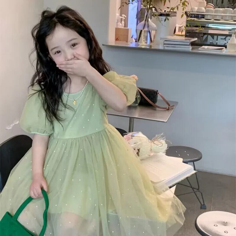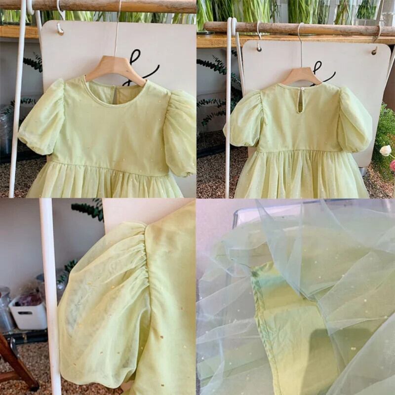 女赤ちゃん半袖グリーンメッシュドレス子供サマードレス子供ドレス ショート ハーフスリーブ 夏物