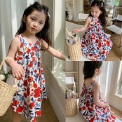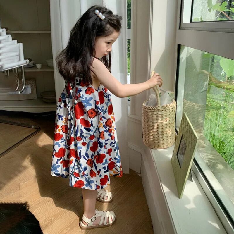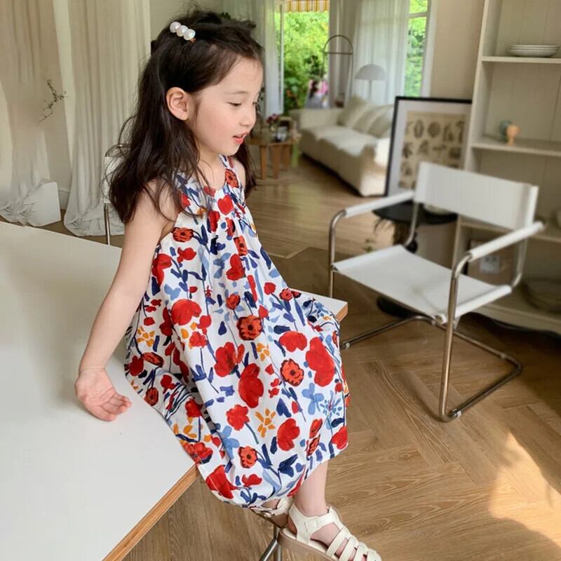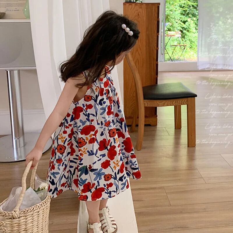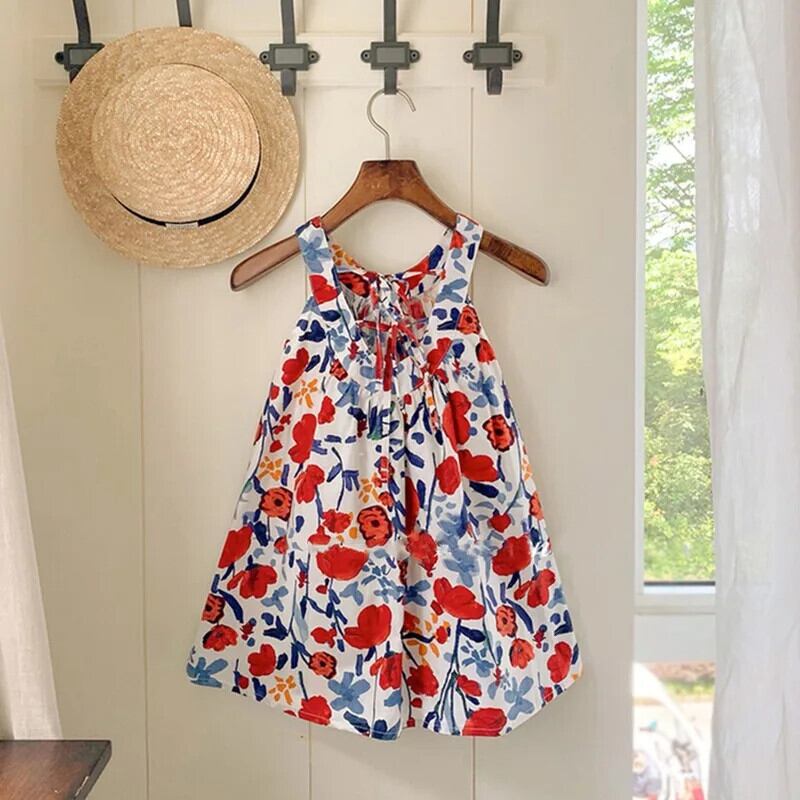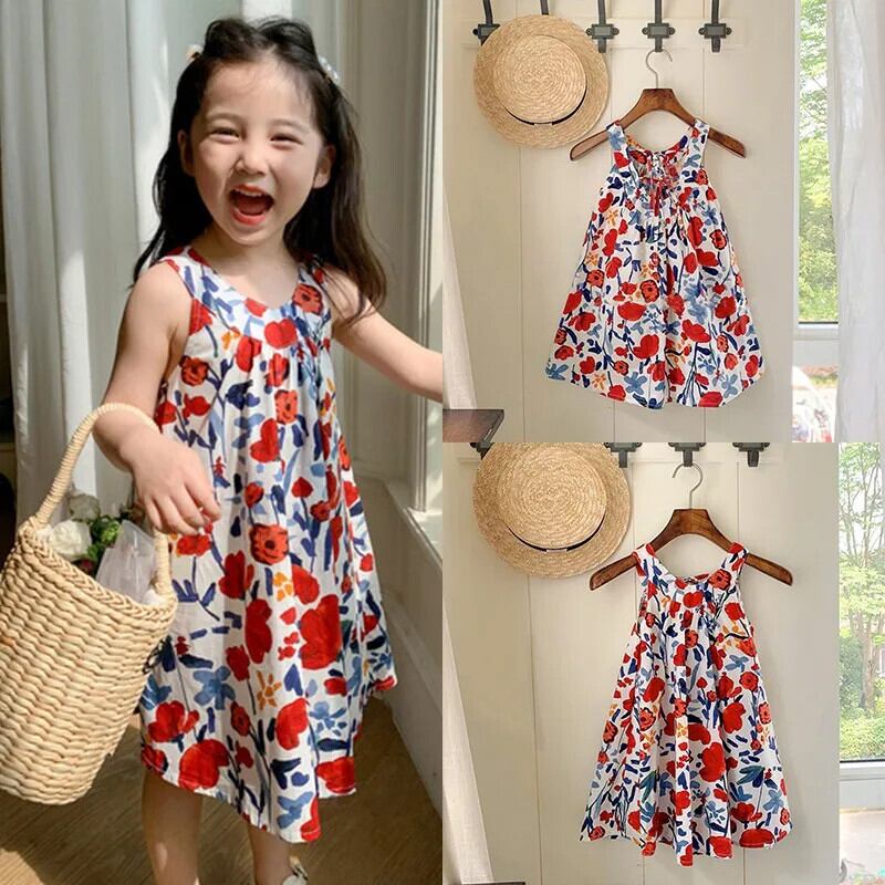 夏キッズガールズドレスレトロビーチ花柄ベストノースリーブドレスコットン子供 サマー 夏物