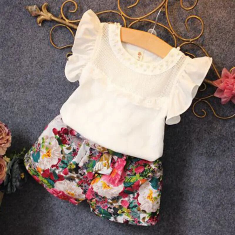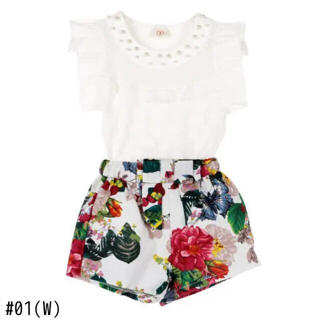 夏子供女赤ちゃんセット 2 枚衣装かわいいメッシュフリルスリーブトップ + 花ショーツ子供 T シャツ + ショートパンツセット 大人ガーリー スウィート キュート カジュアル サマー 夏物 キッズ ブルマー 花柄 Tシャツ | Princess