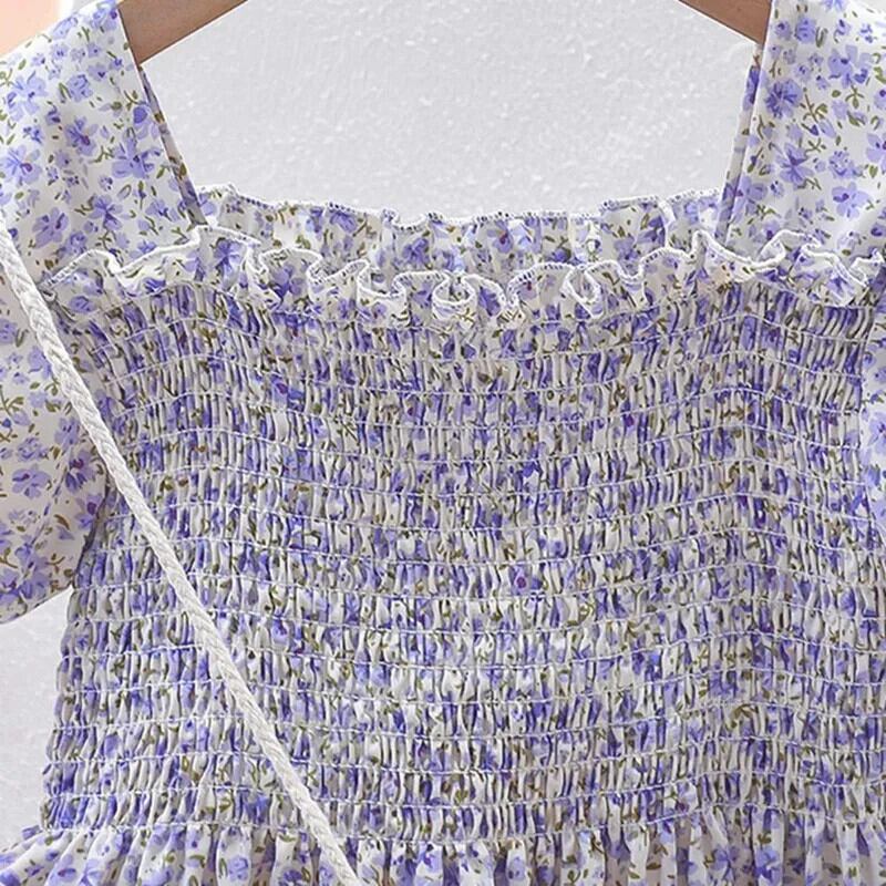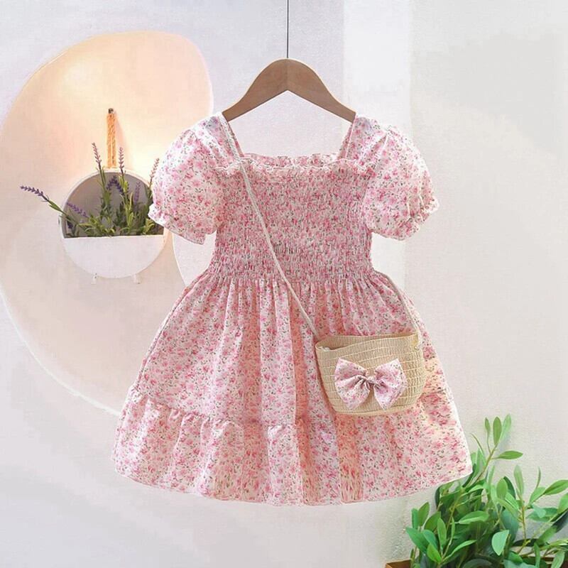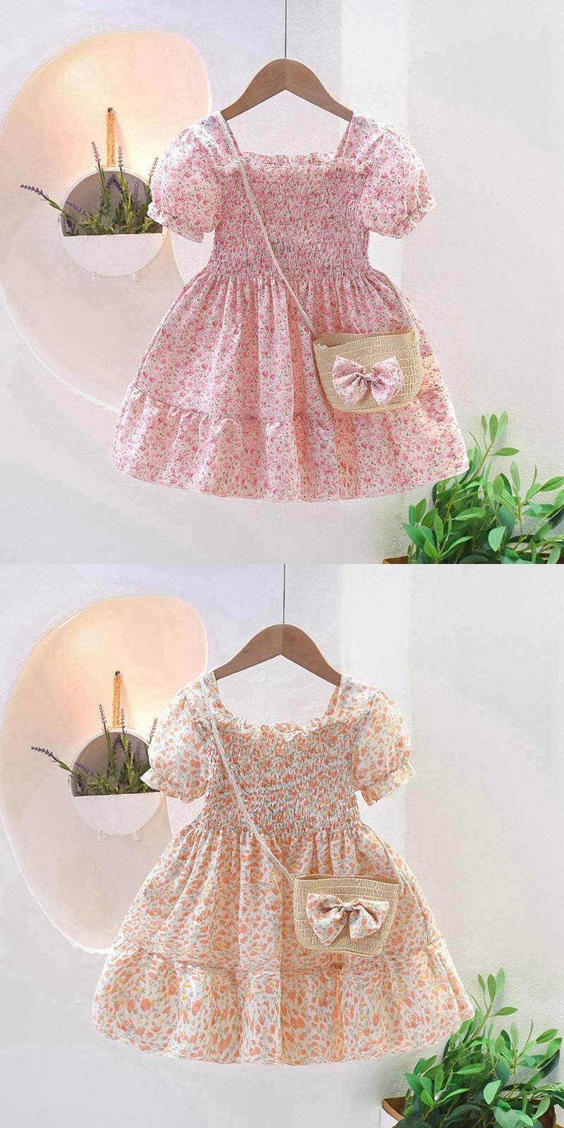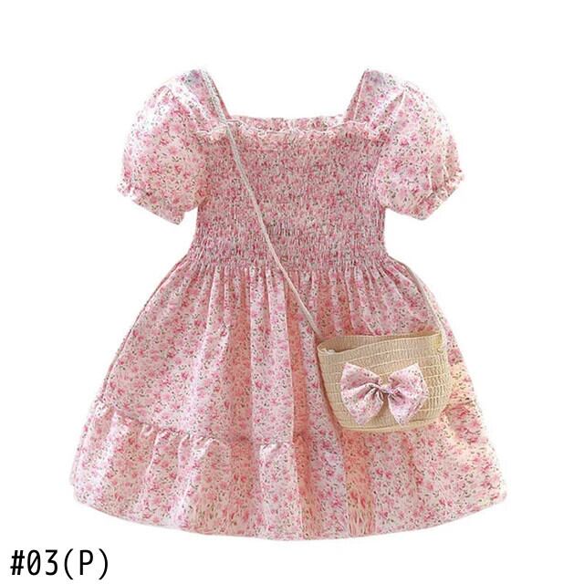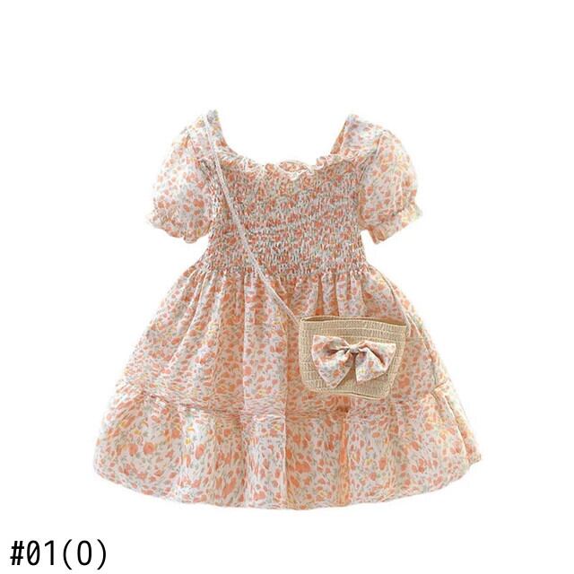 夏幼児女子花柄ドレスわらバッグ付き甘い子供花子供半袖 Vestidos ベビー ショート ハーフスリーブ 大人ガーリー スウィート キュート カジュアル サマー 夏物 キッズ ストローバッグ フラワーデザイン
