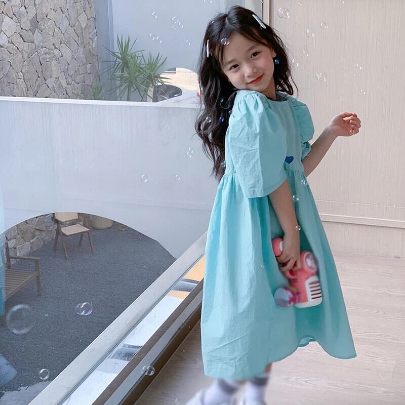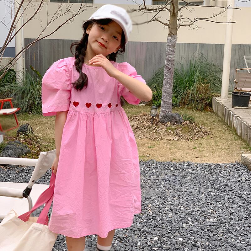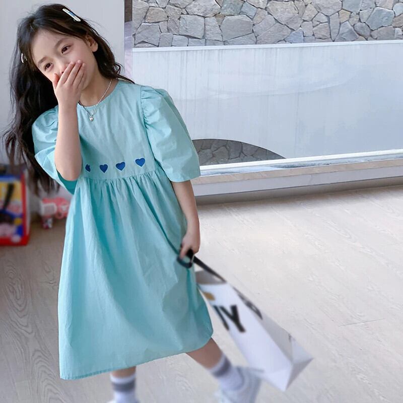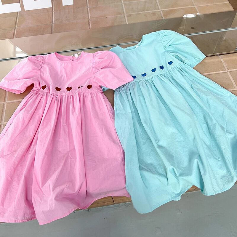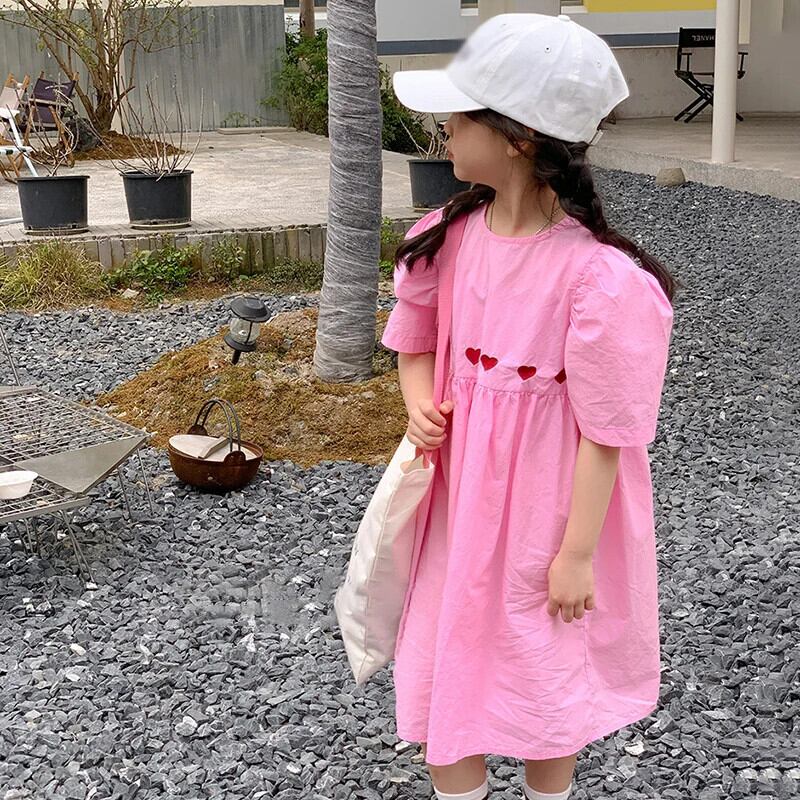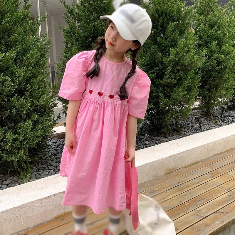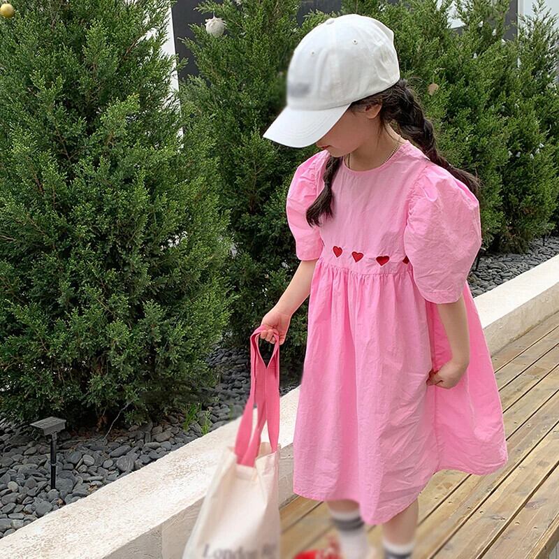 キッズガールズドレス子供夏幼児女赤ちゃんラウンドネックバブルスリーブラブプリントふくらんパーティードレス サマー 夏物 Oネック