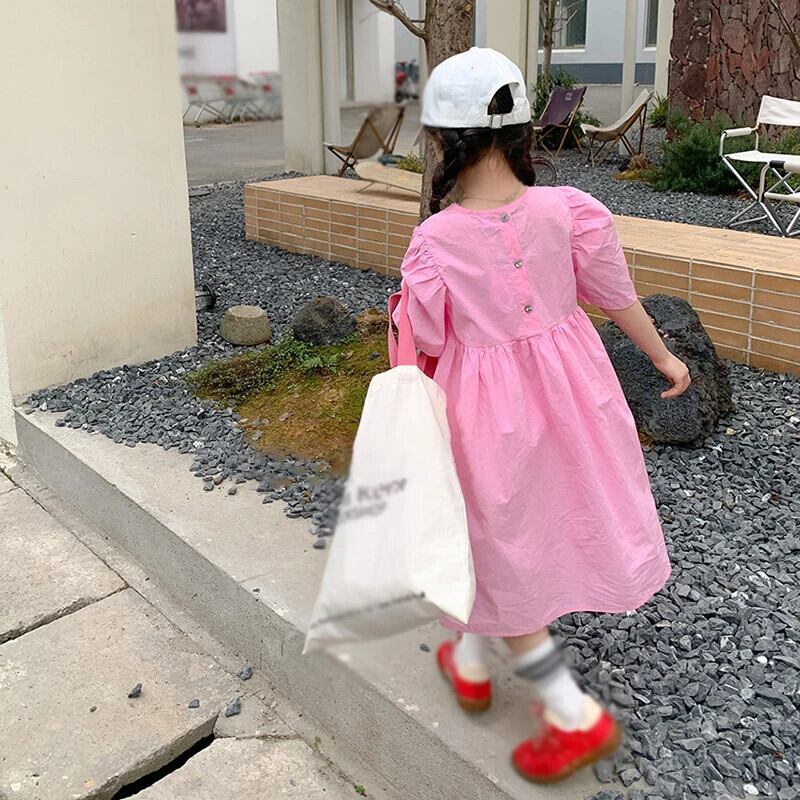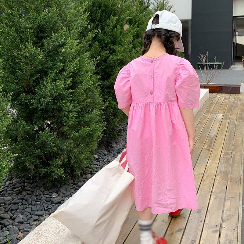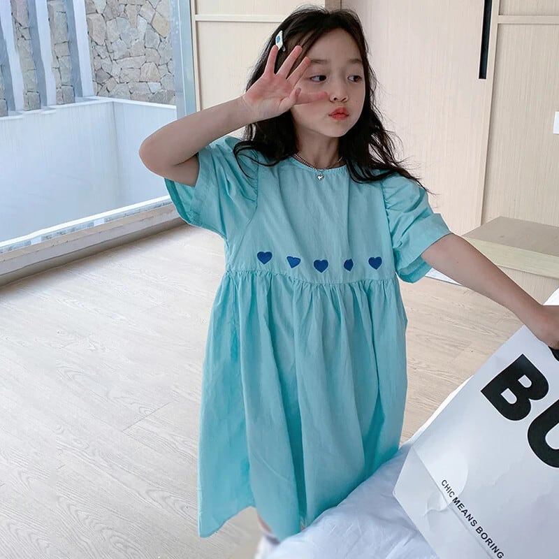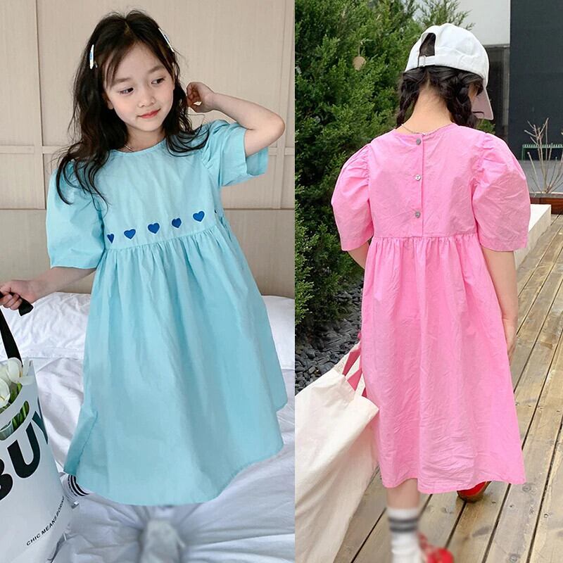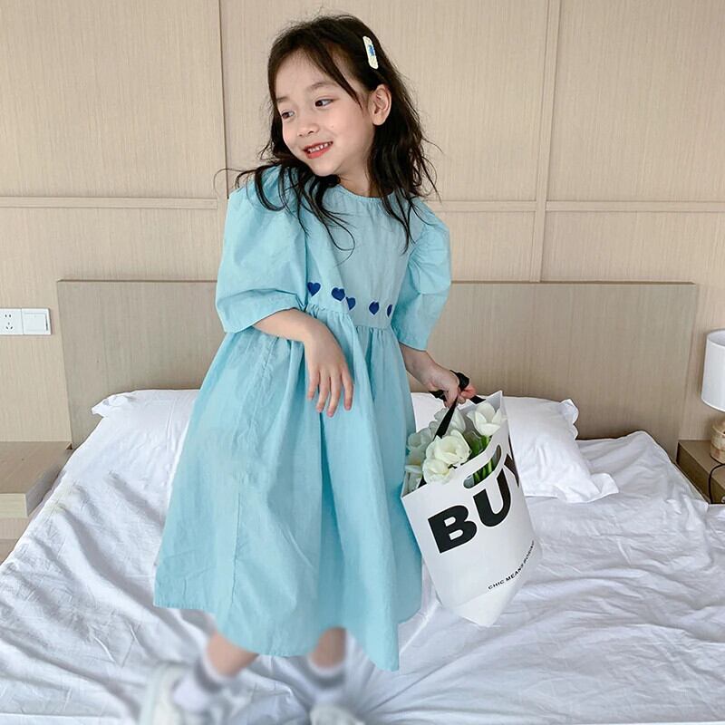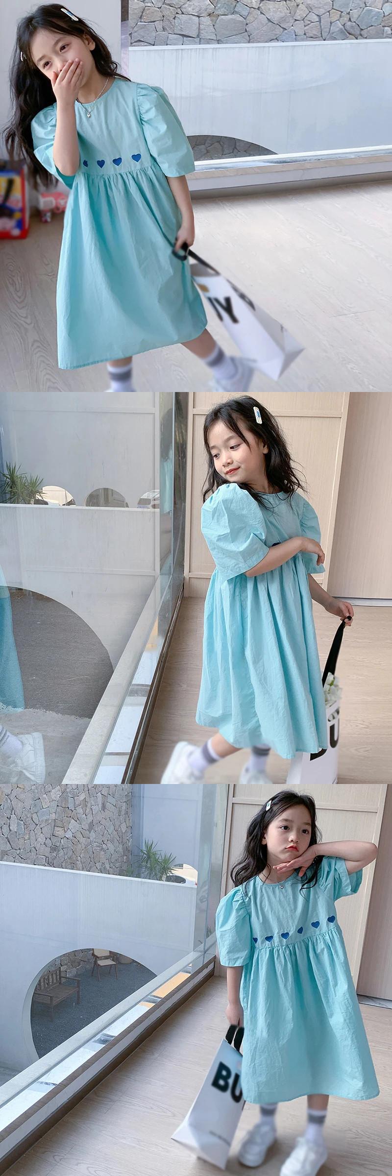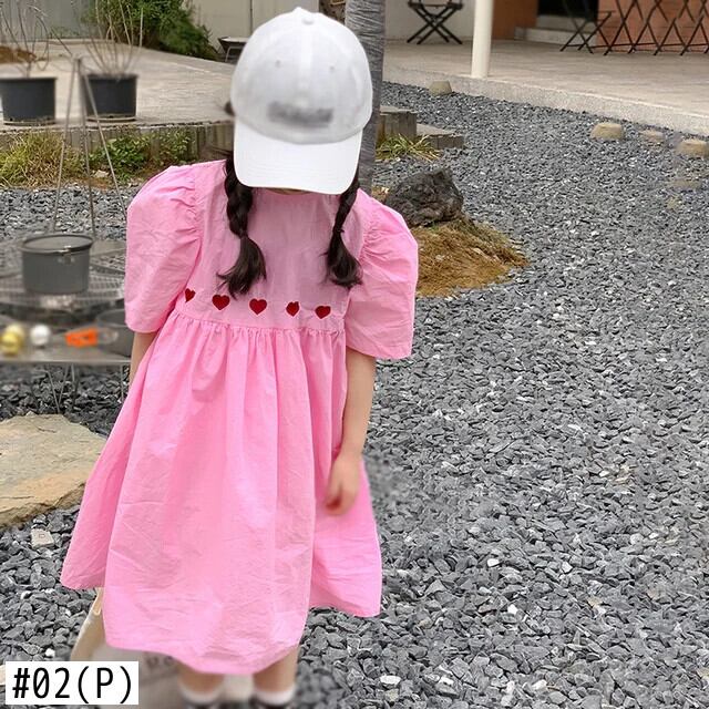 キッズガールズドレス子供夏幼児女赤ちゃんラウンドネックバブルスリーブラブプリントふくらんパーティードレス サマー 夏物 Oネック