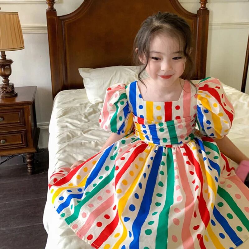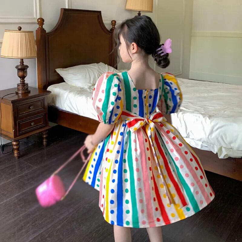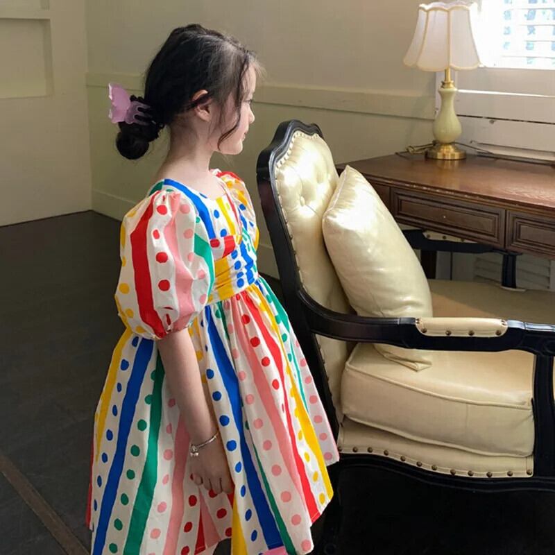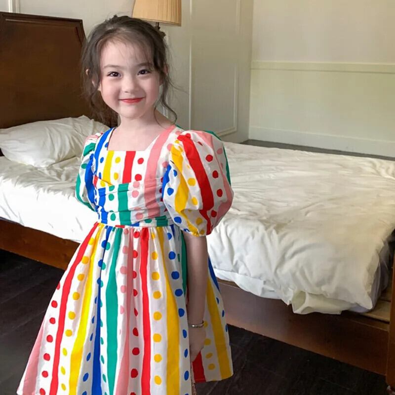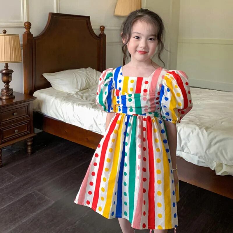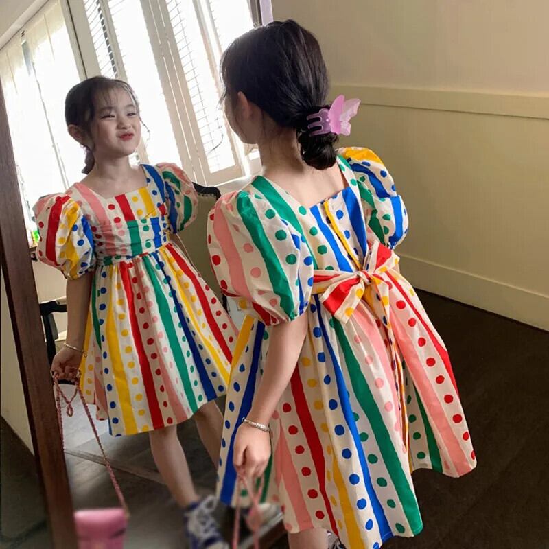 3-8 歳女赤ちゃんドットレインボードレス夏パフスリーブキッズベビーかわいいドレス子供 大人ガーリー スウィート キュート カジュアル サマー 夏物