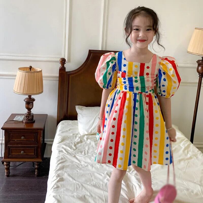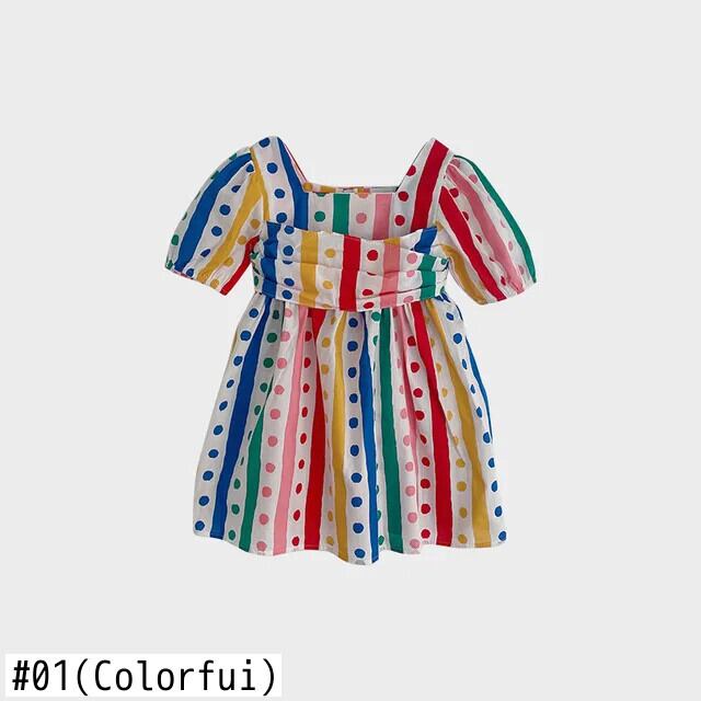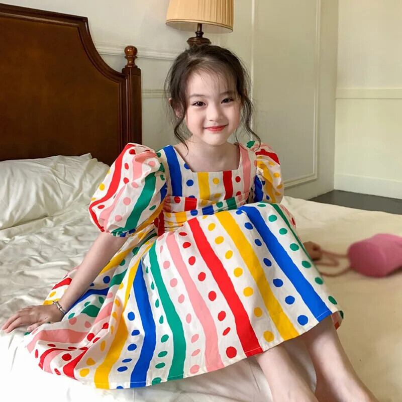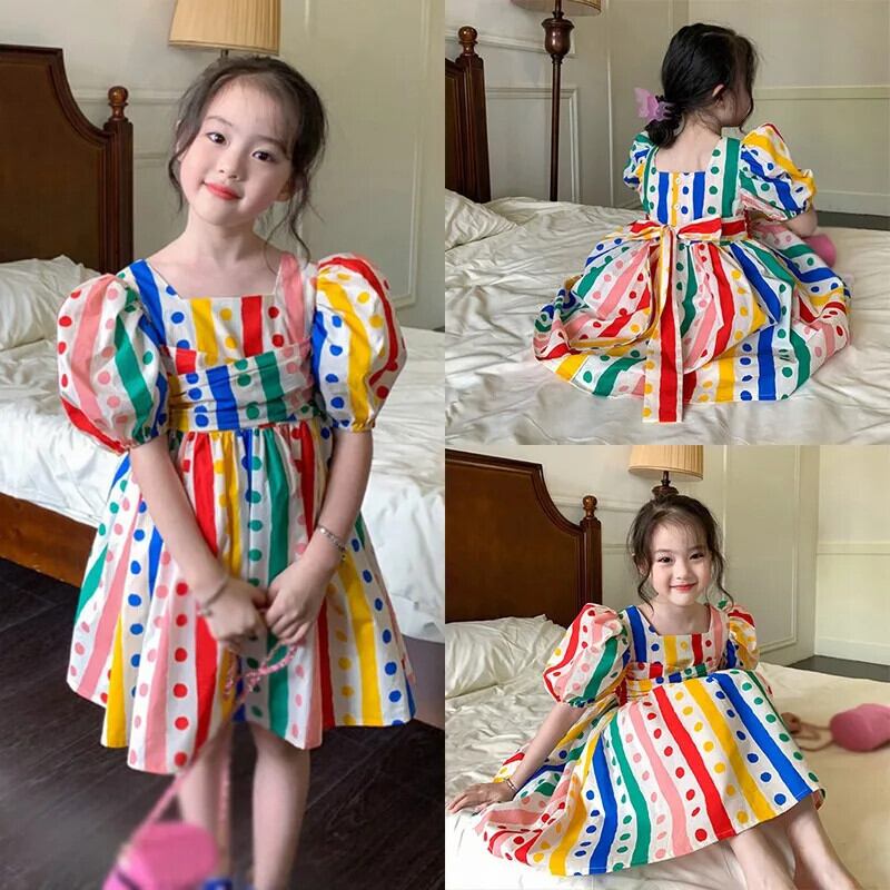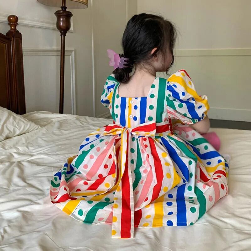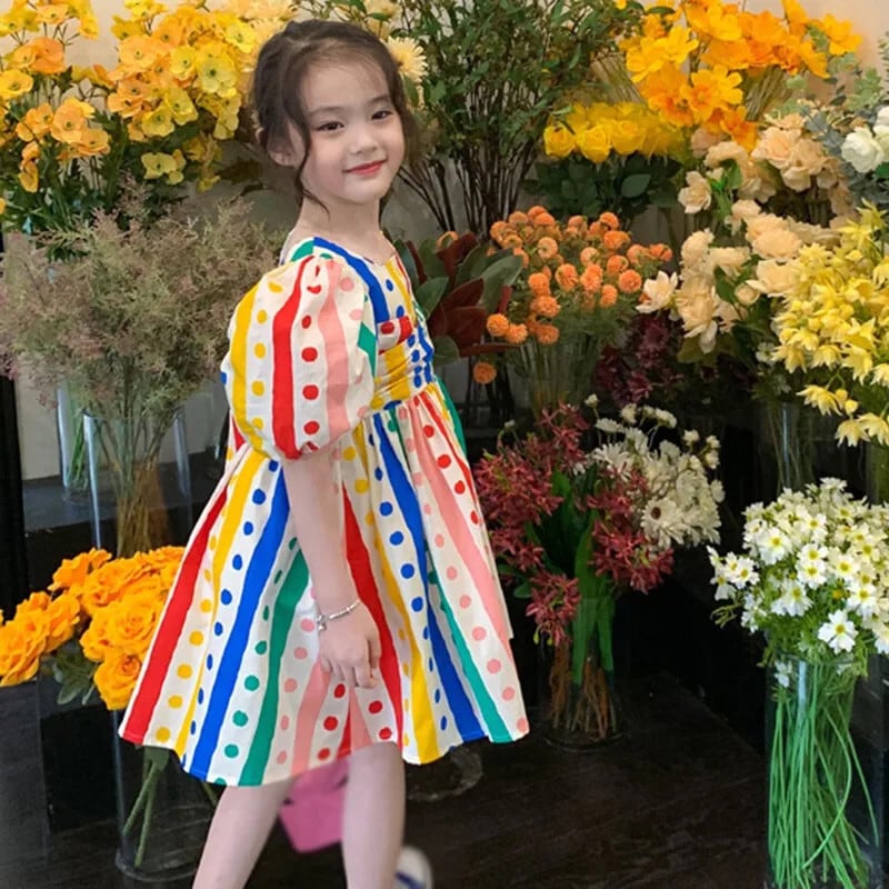 3-8 歳女赤ちゃんドットレインボードレス夏パフスリーブキッズベビーかわいいドレス子供 大人ガーリー スウィート キュート カジュアル サマー 夏物