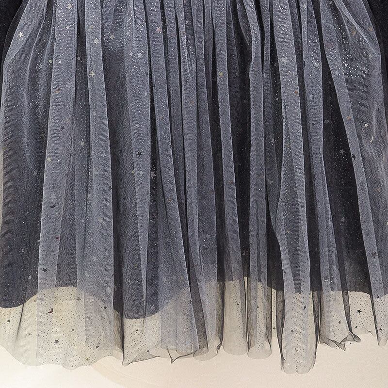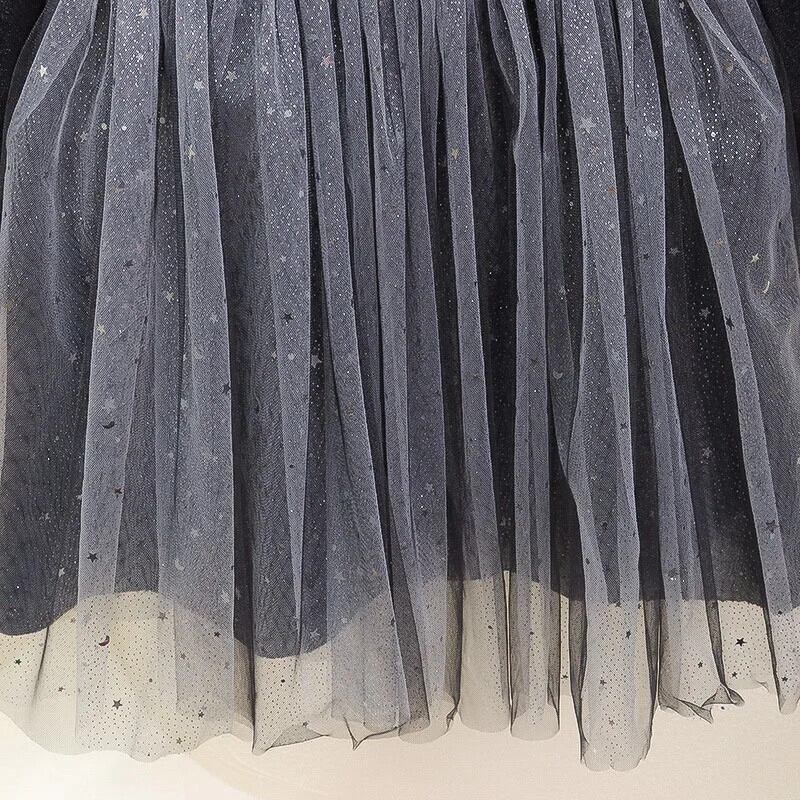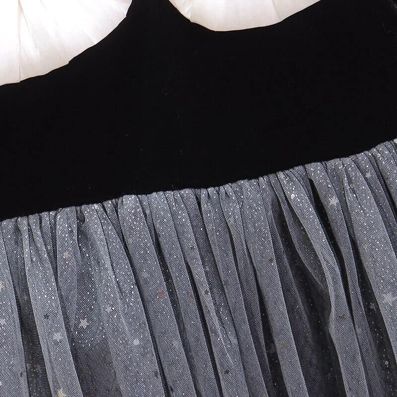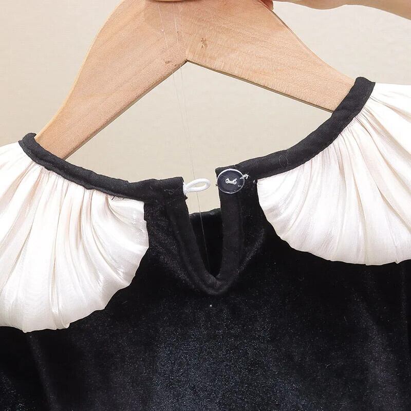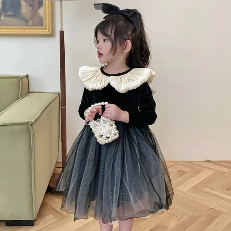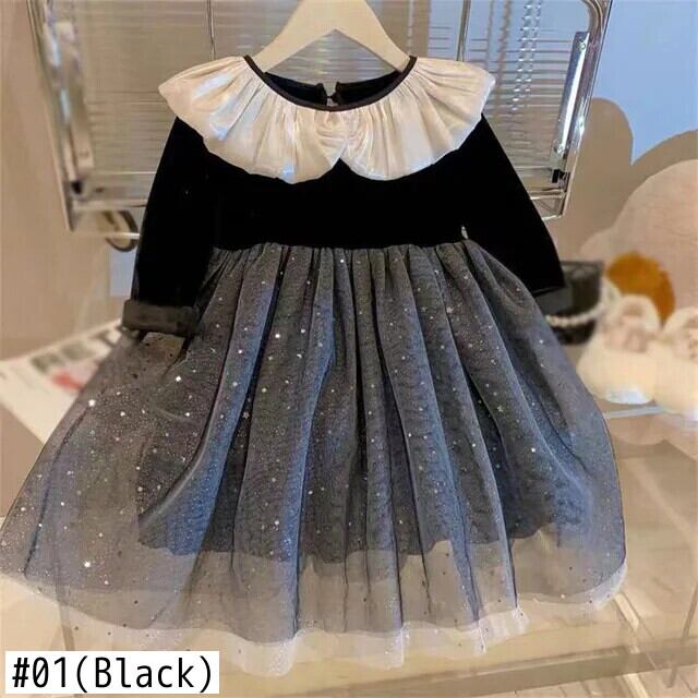 女子春ドレス黒ベルベットメッシュパーティードレス誕生日ドレス 1-7Y 子供キッズドレス ブラック スプリング 春物