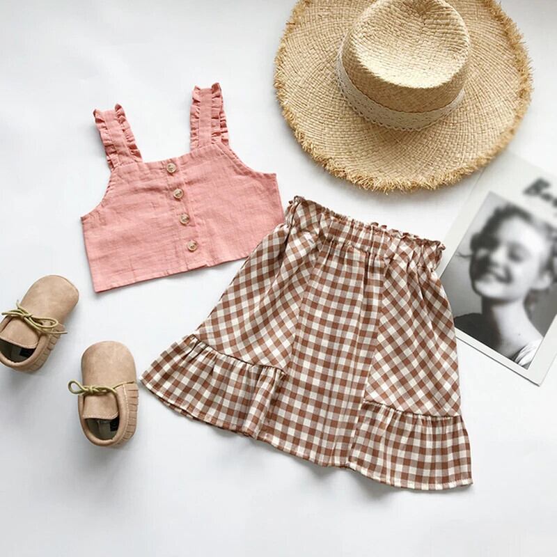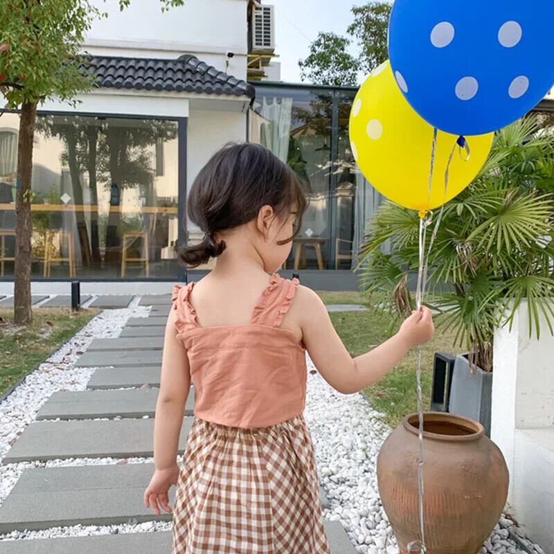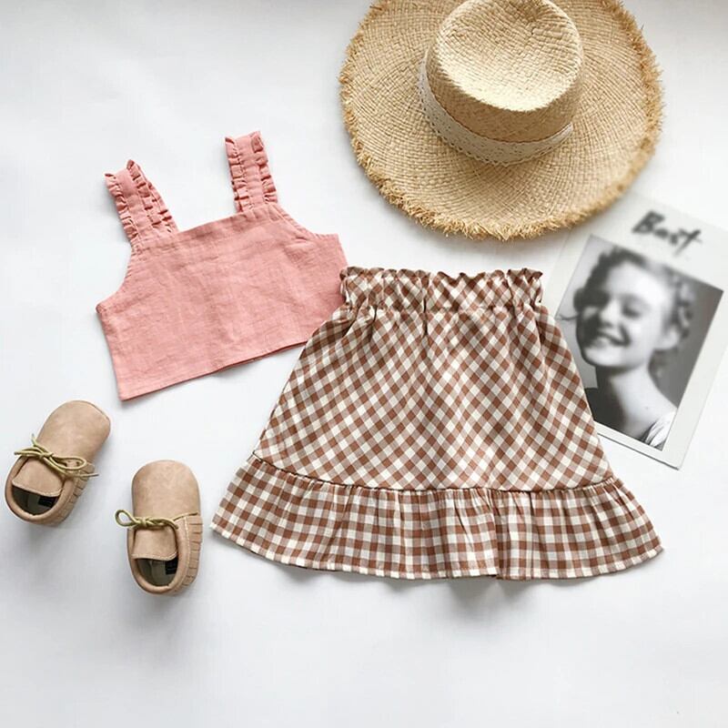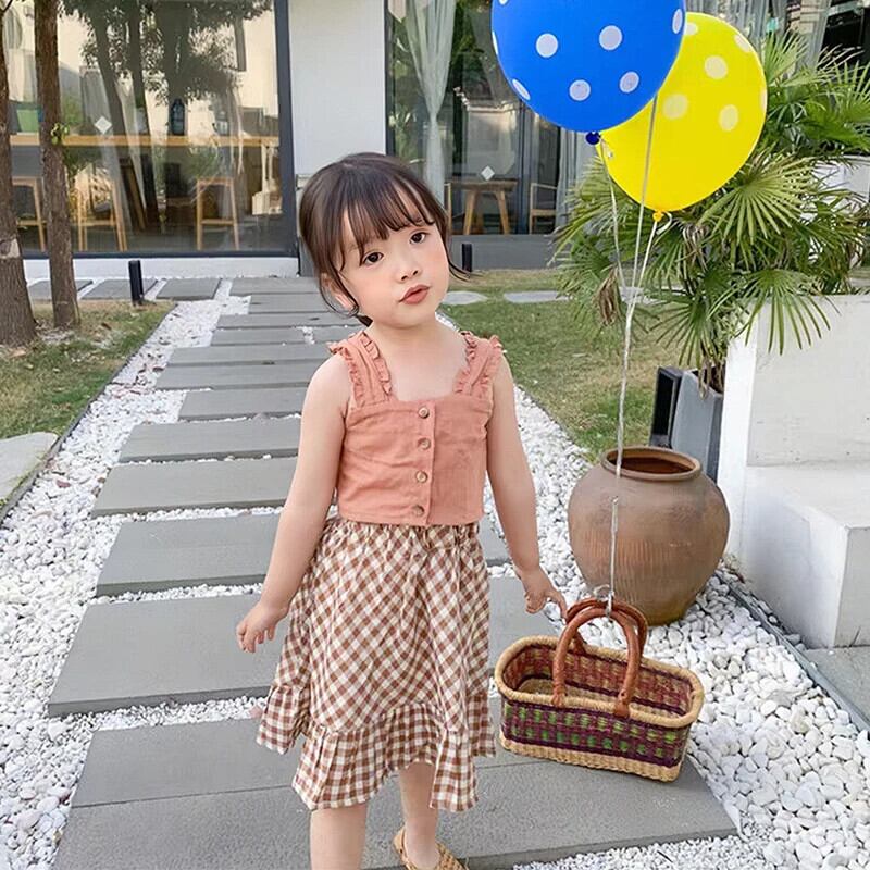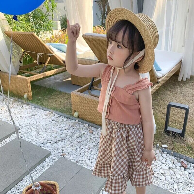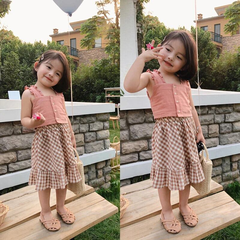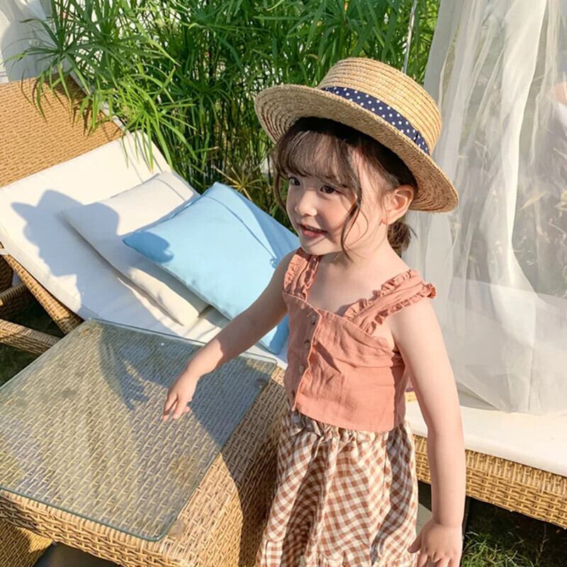 3-9Y キッズ子供女子セット夏ノースリーブホルタートップチェック柄半身スカートスーツキッズガールスーツ サマー 夏物