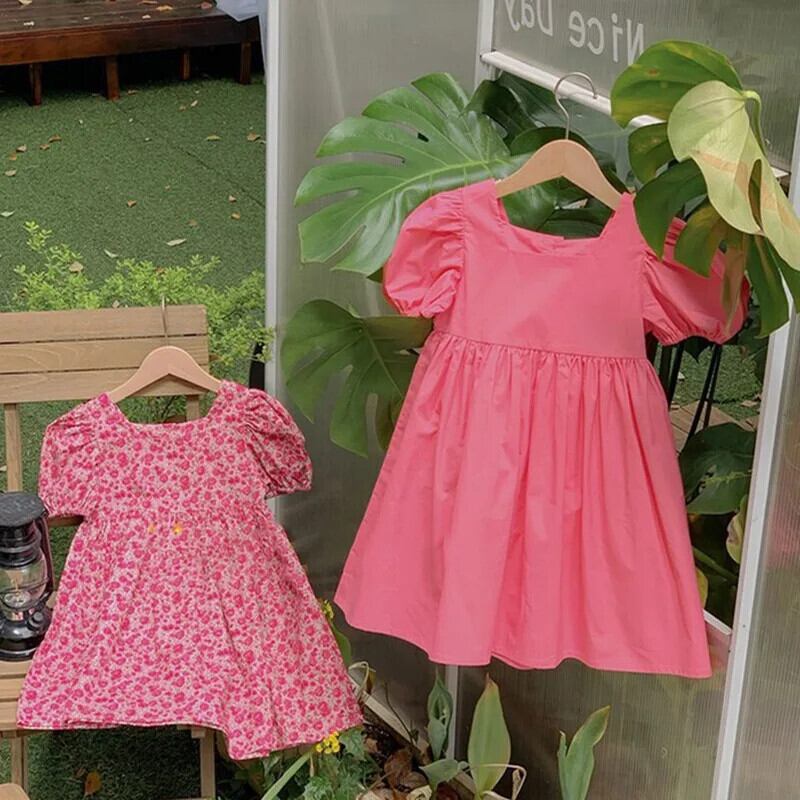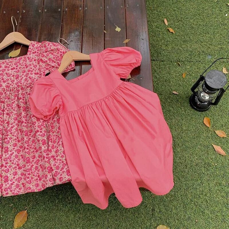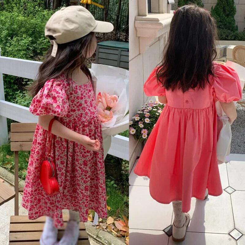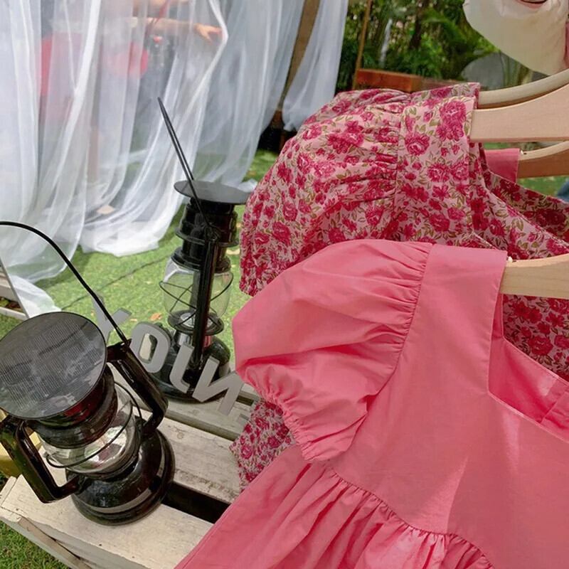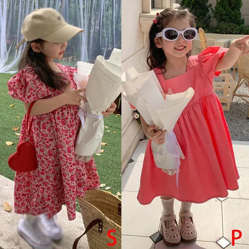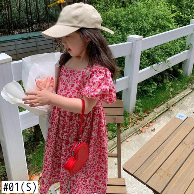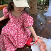 夏子供女子ドレススクエア襟花柄ウエストふくらんドレスバブル袖キッズガールドレス サマー 夏物 スクウェア