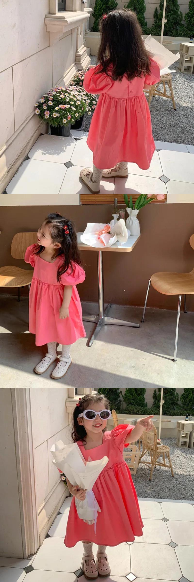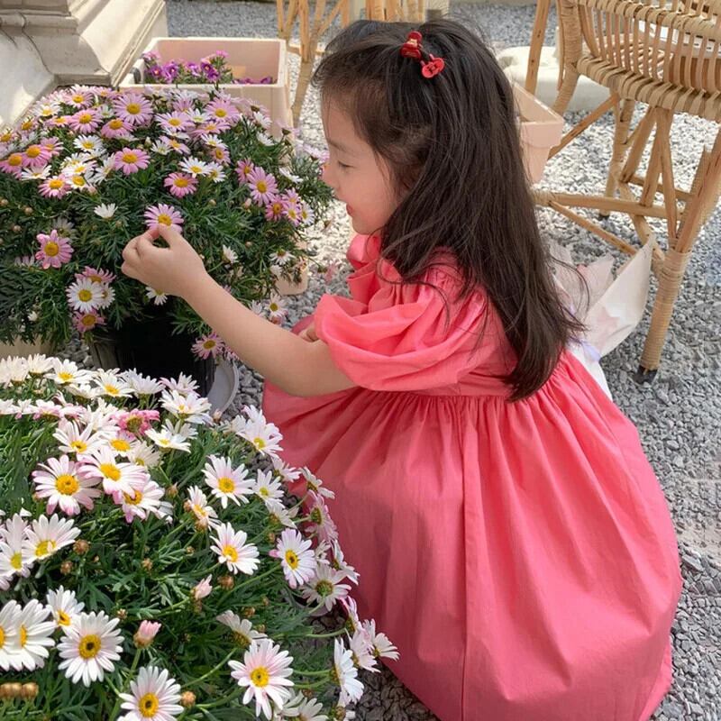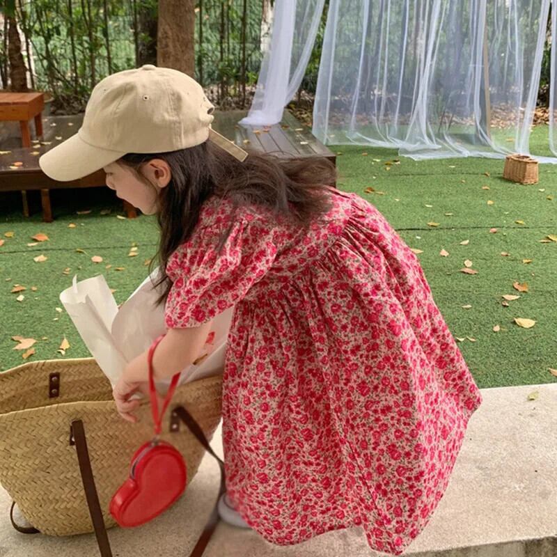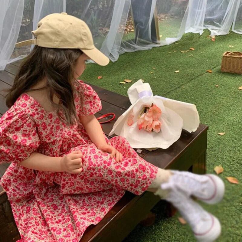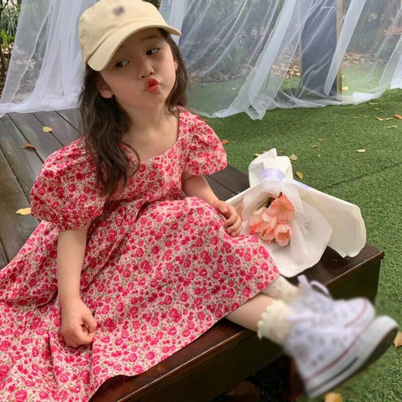 夏子供女子ドレススクエア襟花柄ウエストふくらんドレスバブル袖キッズガールドレス サマー 夏物 スクウェア