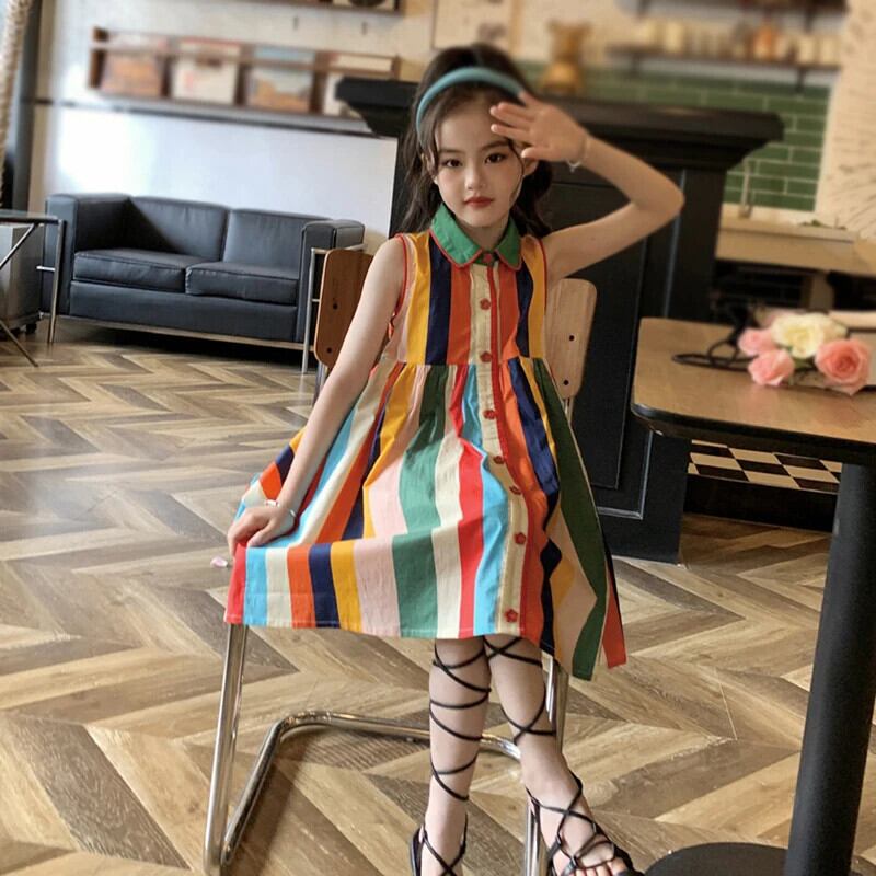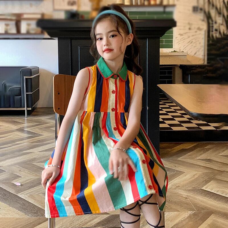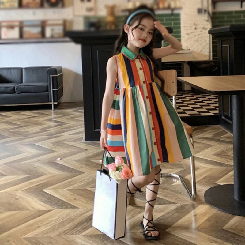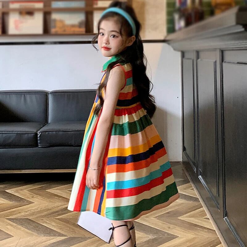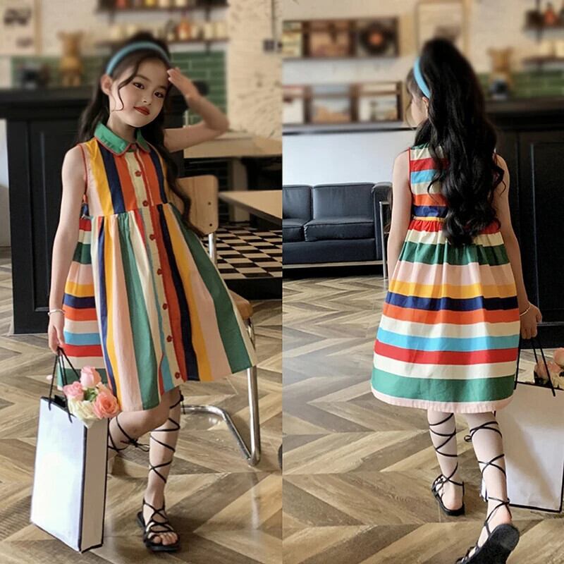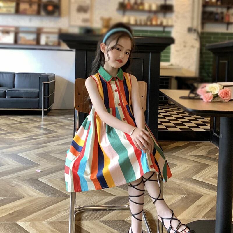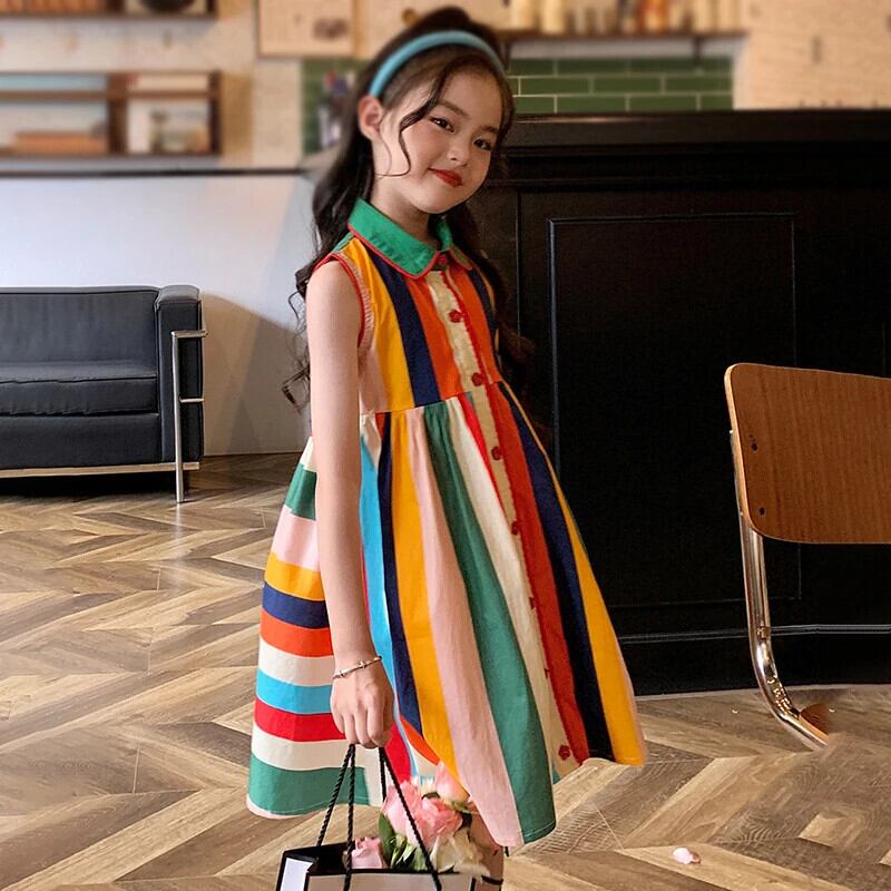 夏子供女子ノースリーブカラフルストライプドレス幼児女赤ちゃん甘いドレス 大人ガーリー スウィート キュート カジュアル サマー 夏物