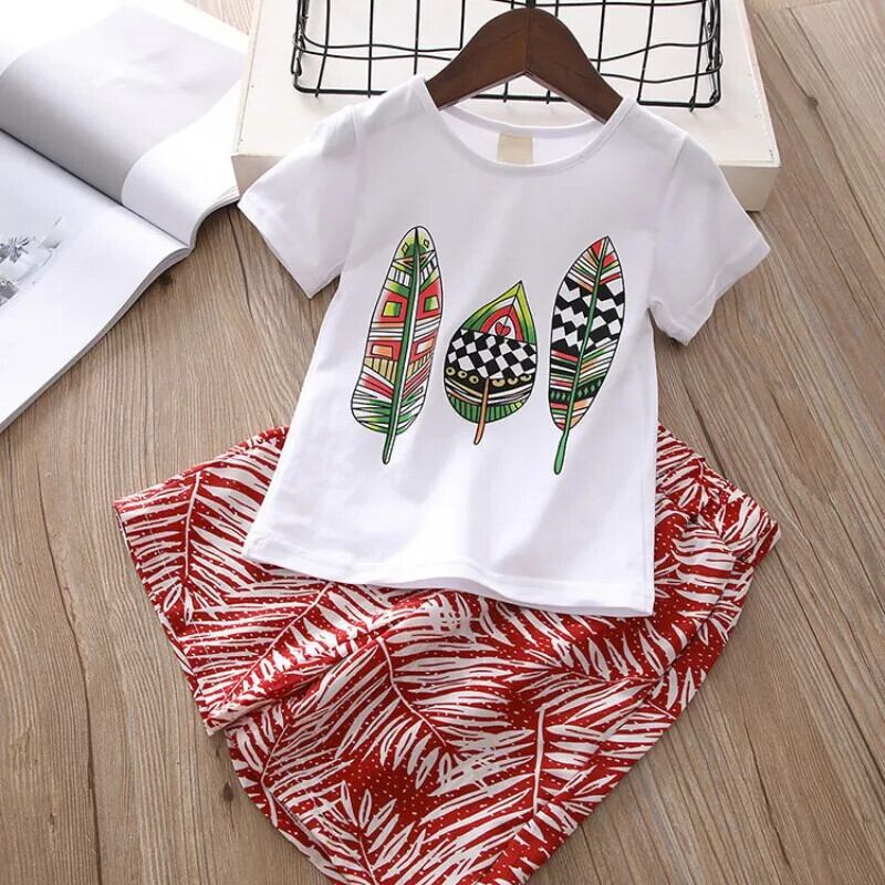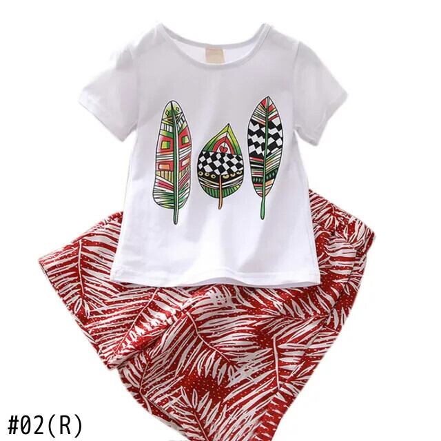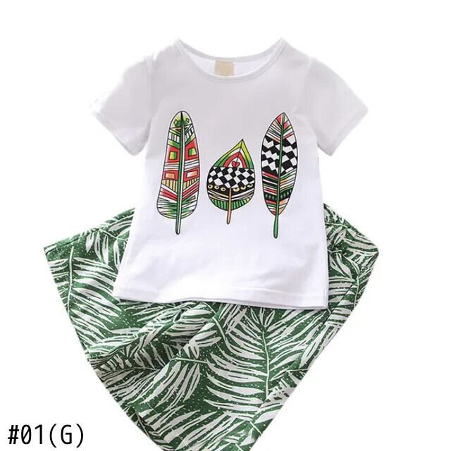 子供夏セット女子リーフ柄 Tシャツ半袖トップスとワイドレッグルーズロングパンツスーツ子供女子 ショート ハーフスリーブ サマー 夏物 ワイドパンツ