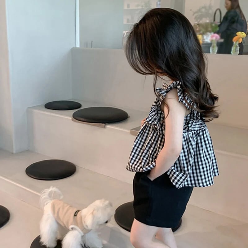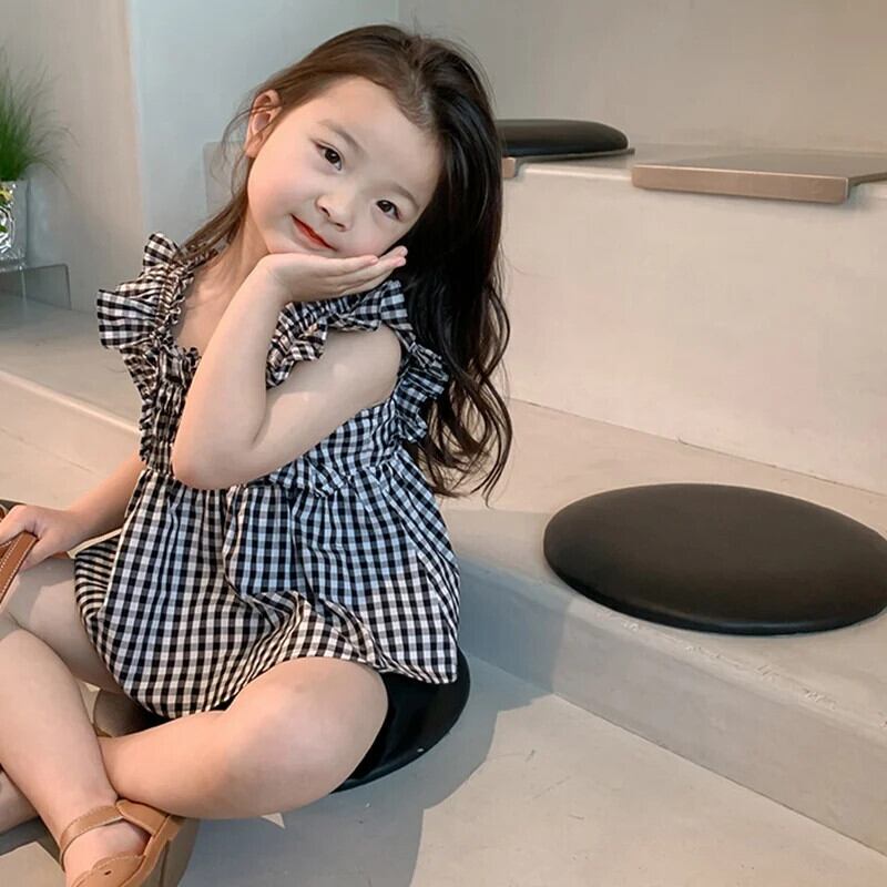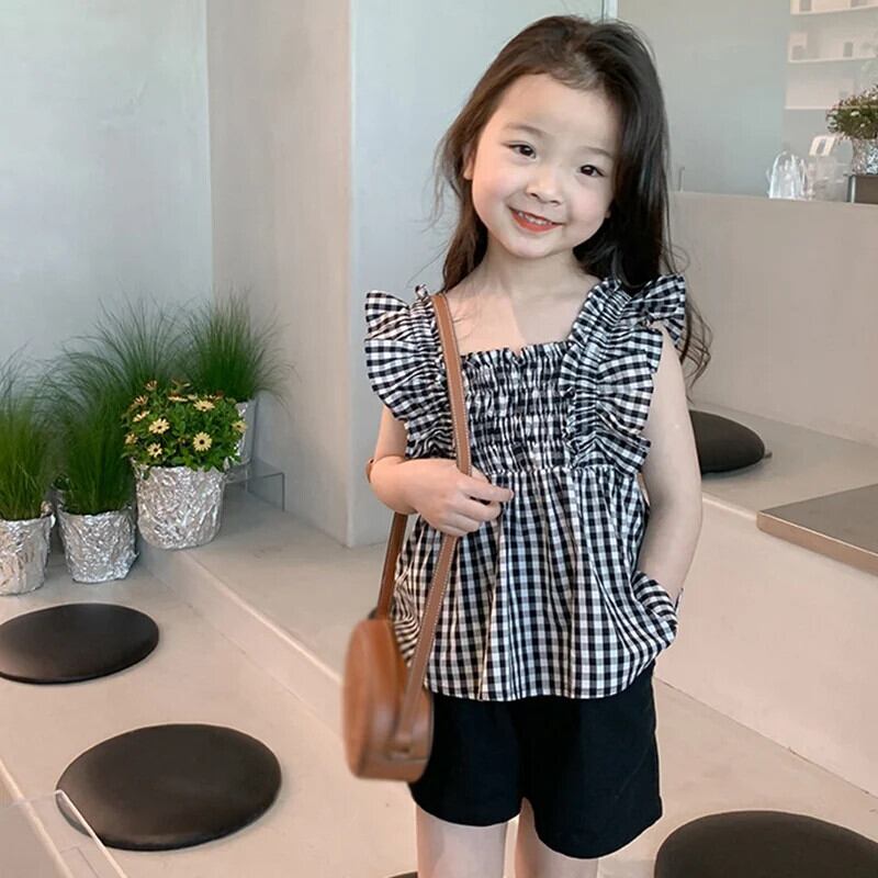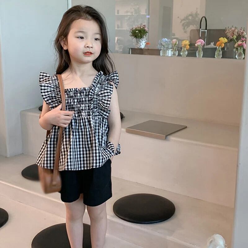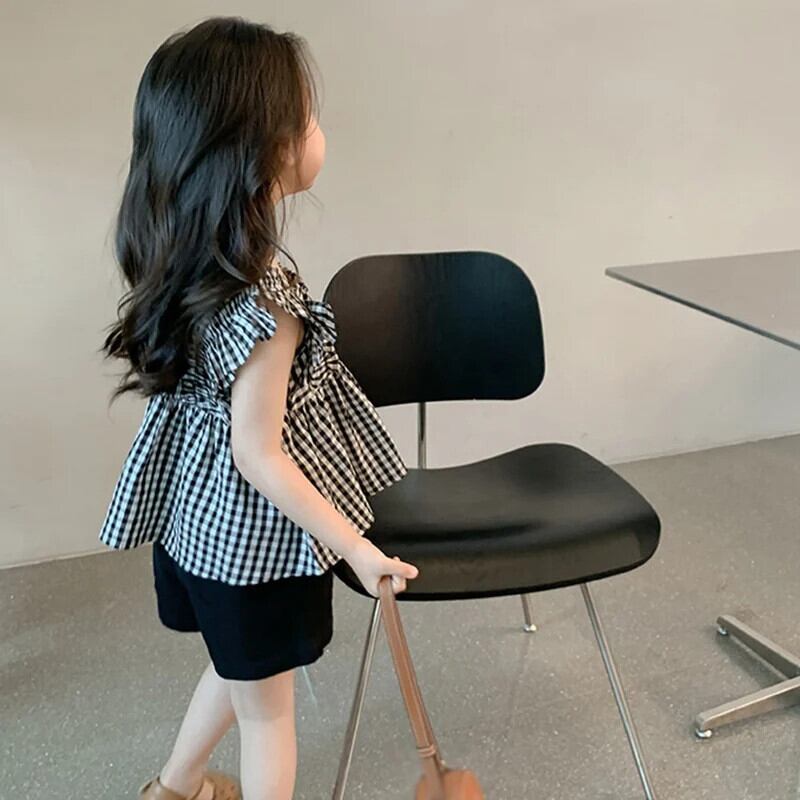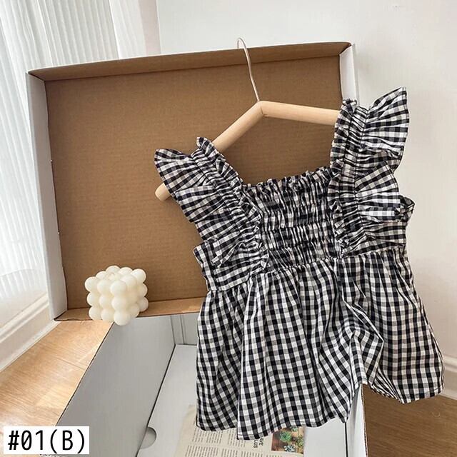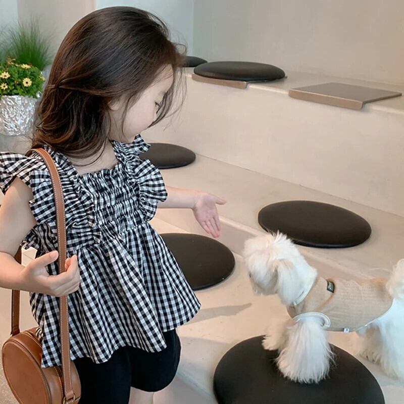 夏キッズベビーガールズトップスクエアネック小さフライスリーブチェック柄シャツ子供女子甘い気質トップス 大人ガーリー スウィート キュート カジュアル サマー 夏物 スクウェア