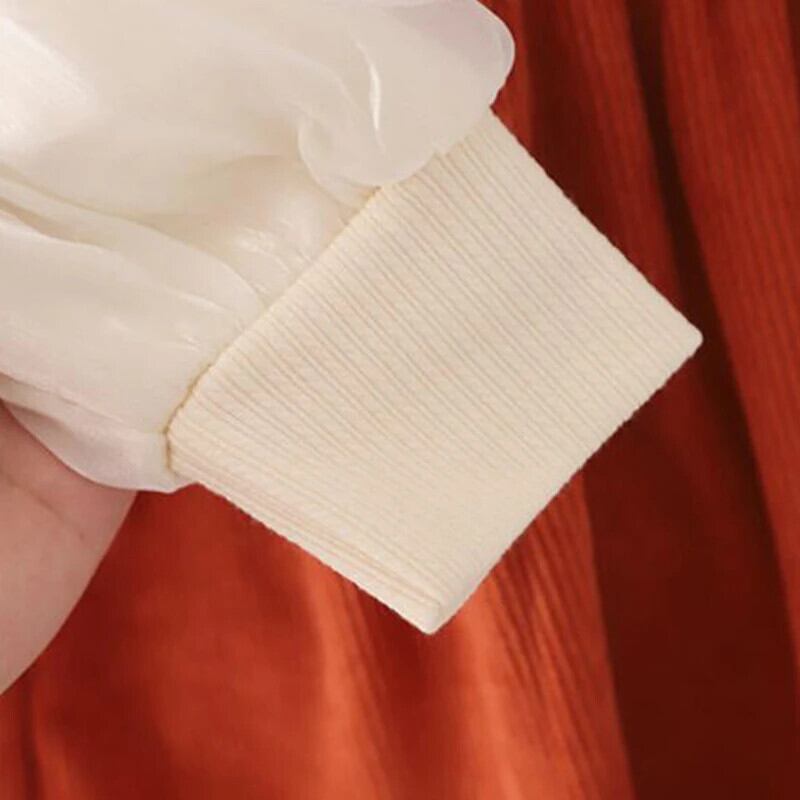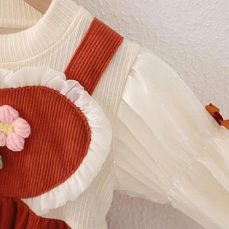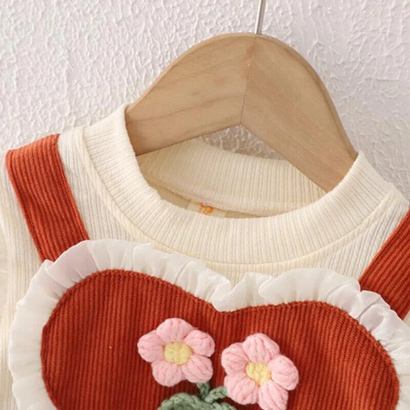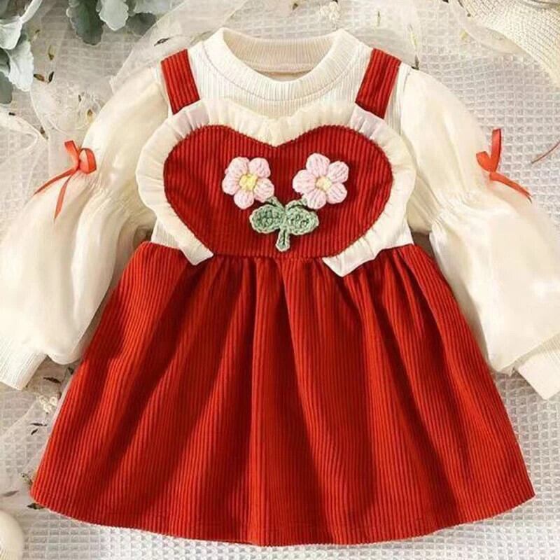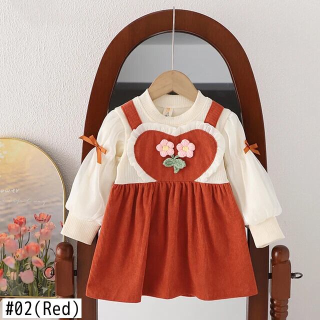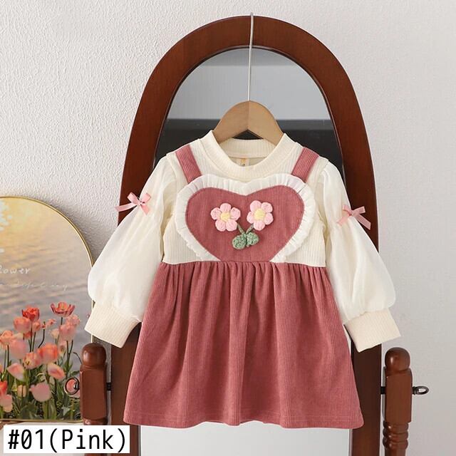 秋女赤ちゃん長袖ドレス春ニットフラワー O 襟フェイクツーピースドレス幼児子供 ロング スプリング 春物 オータム 秋物 キッズ フラワーデザイン