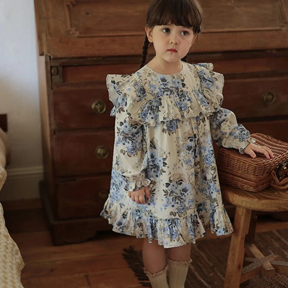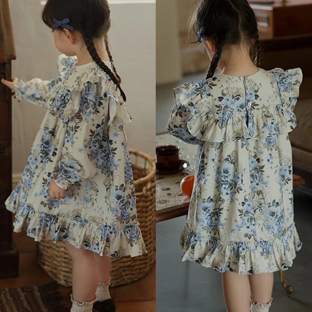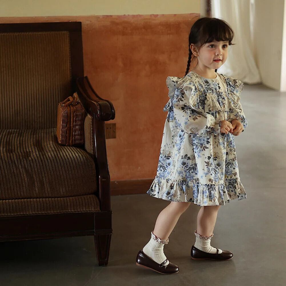 秋女子フライングスリーブフラワープリントドレス秋バージョン長袖レトロドレスキッズドレス ロング オータム 秋物 フラワーデザイン