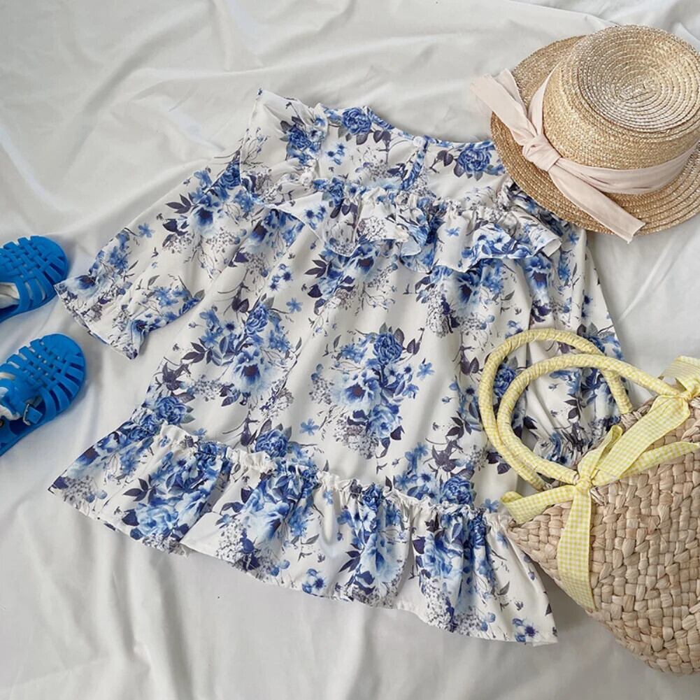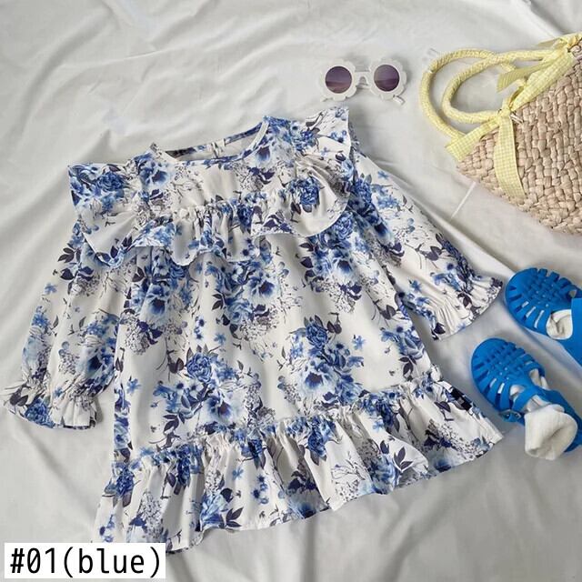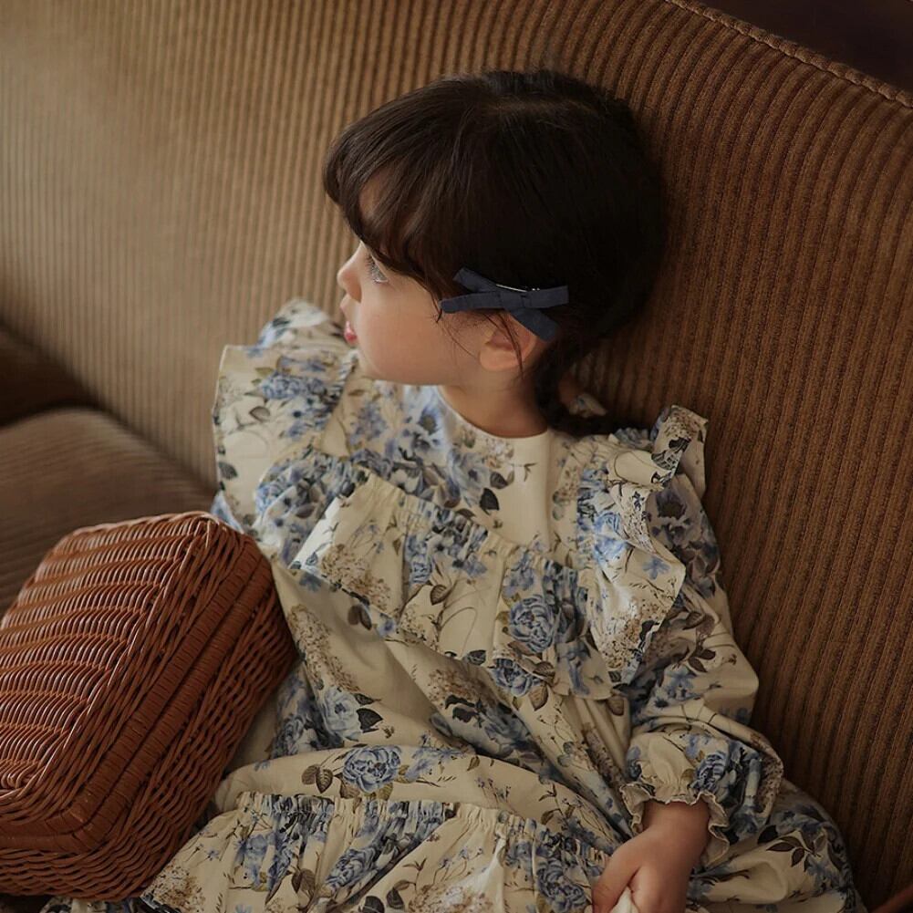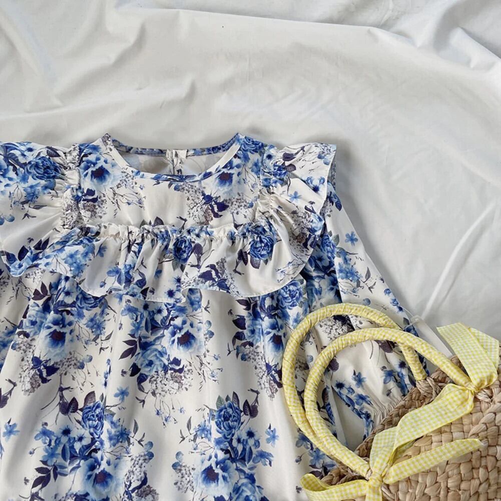 秋女子フライングスリーブフラワープリントドレス秋バージョン長袖レトロドレスキッズドレス ロング オータム 秋物 フラワーデザイン