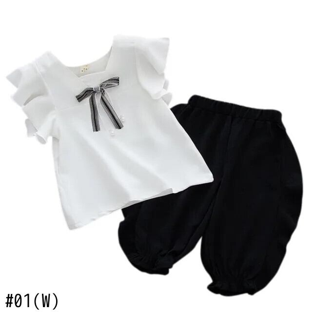 夏子供女赤ちゃん無地フライスリーブボウトップス Tシャツ + ショートパンツスーツセット リボン サマー 夏物 ソリッドカラー