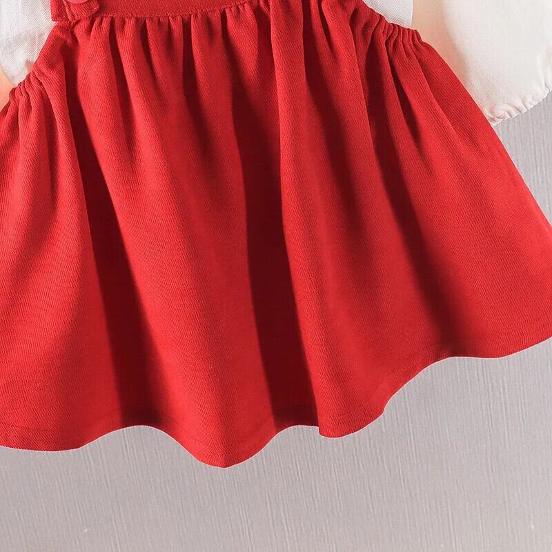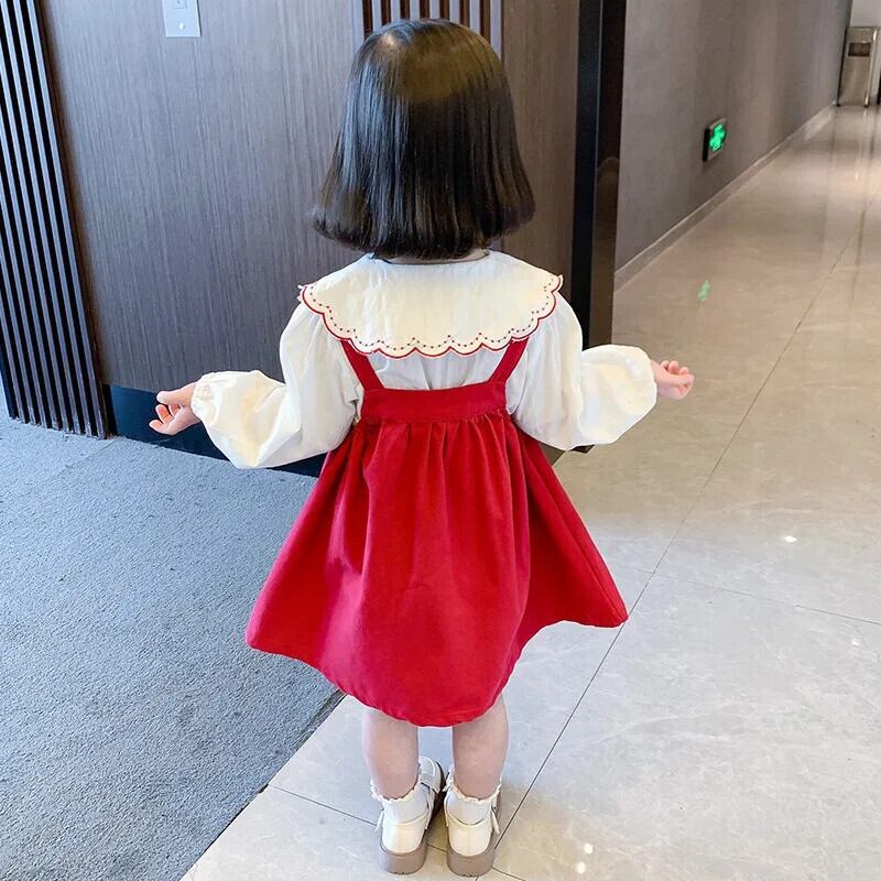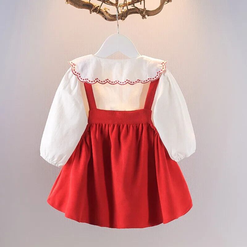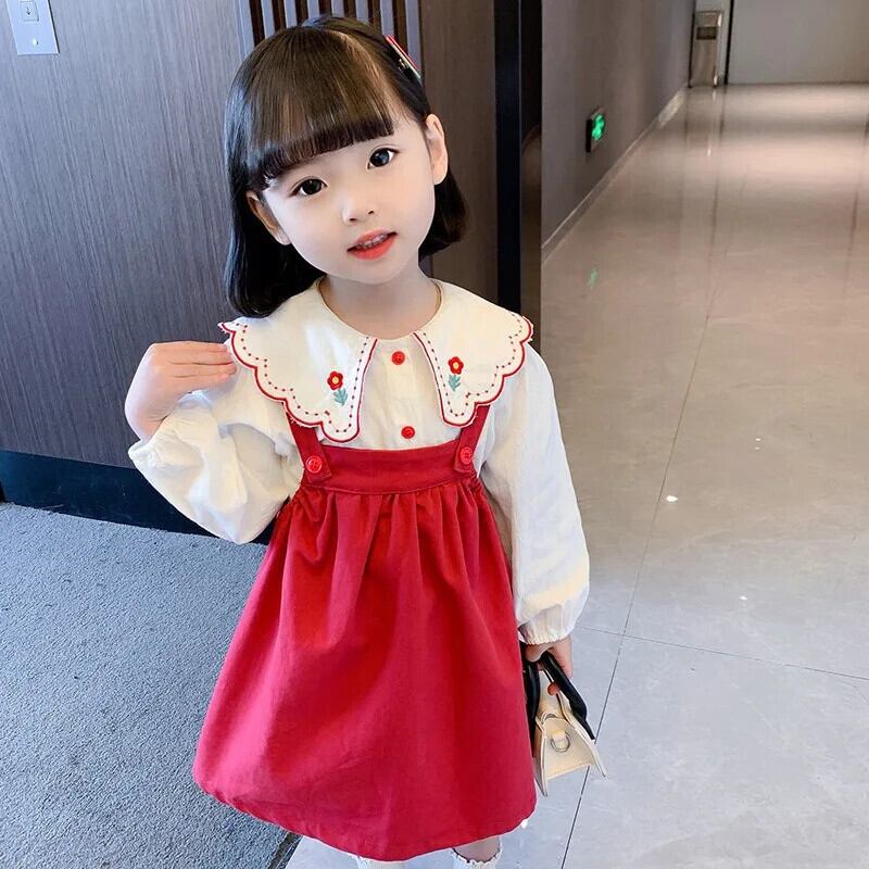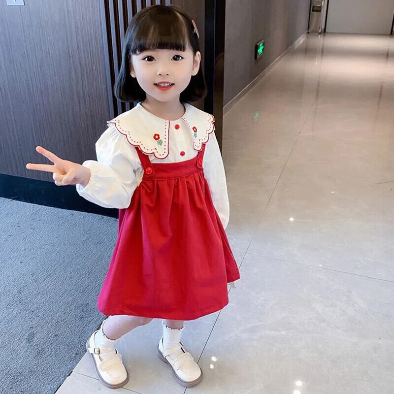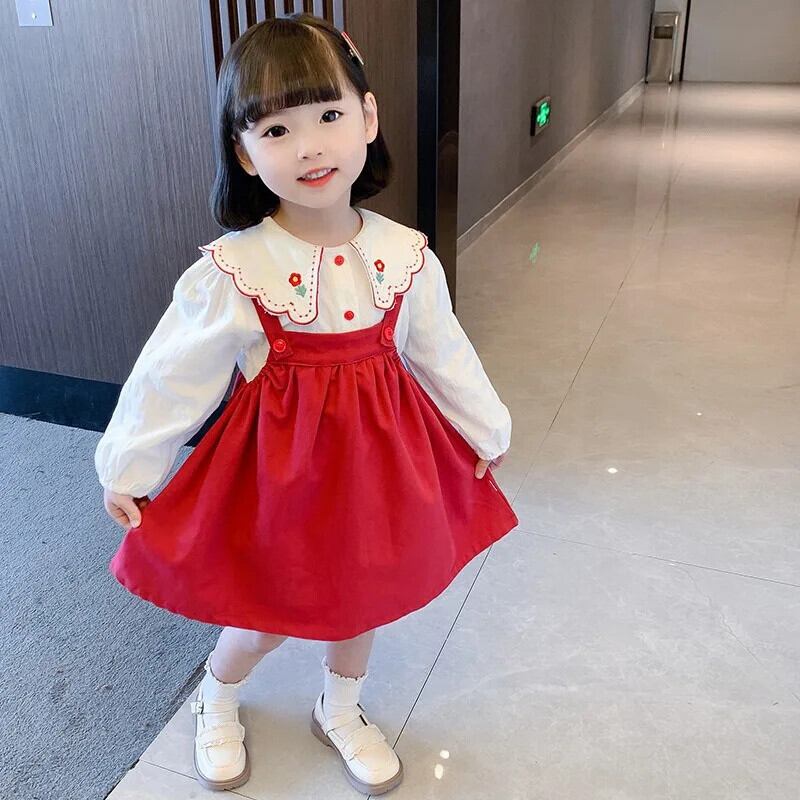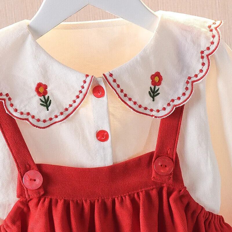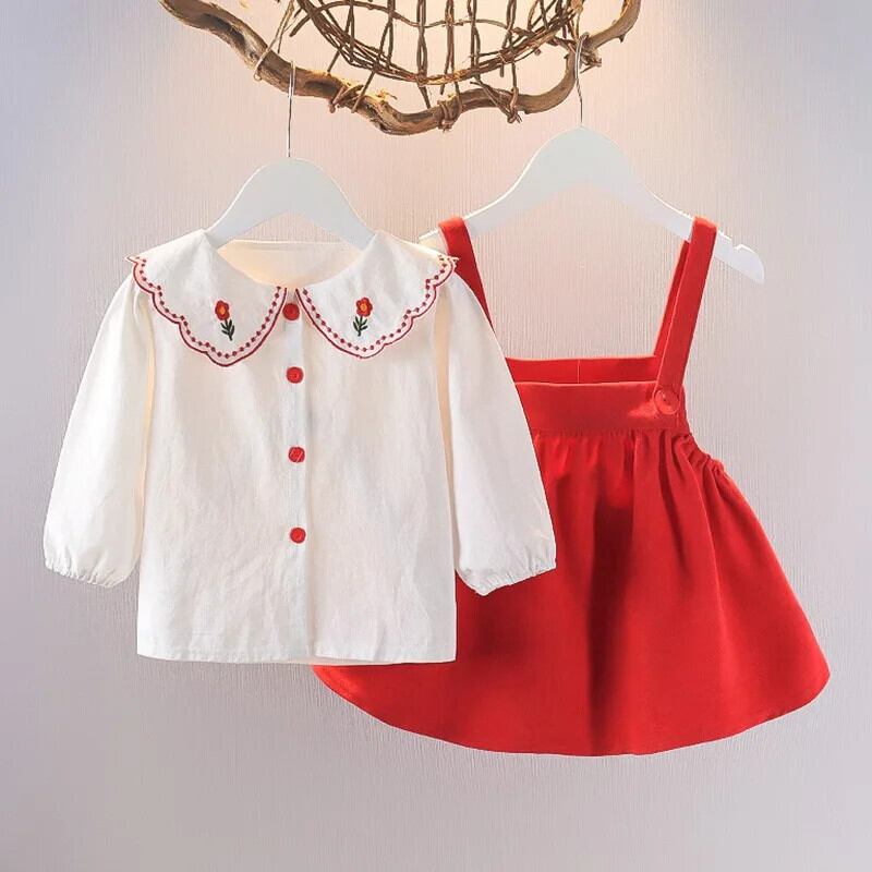 幼児女赤ちゃん秋甘い刺繍シャツストラップスカートツーピーススーツ幼児女子かわいい衣装 レッド 大人ガーリー スウィート キュート カジュアル オータム 秋物