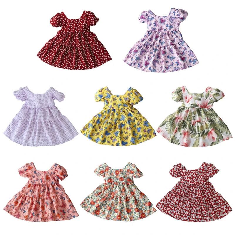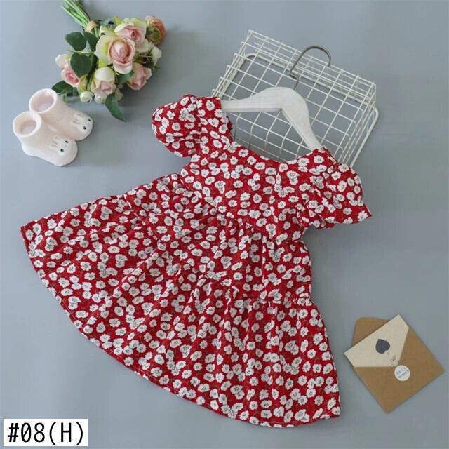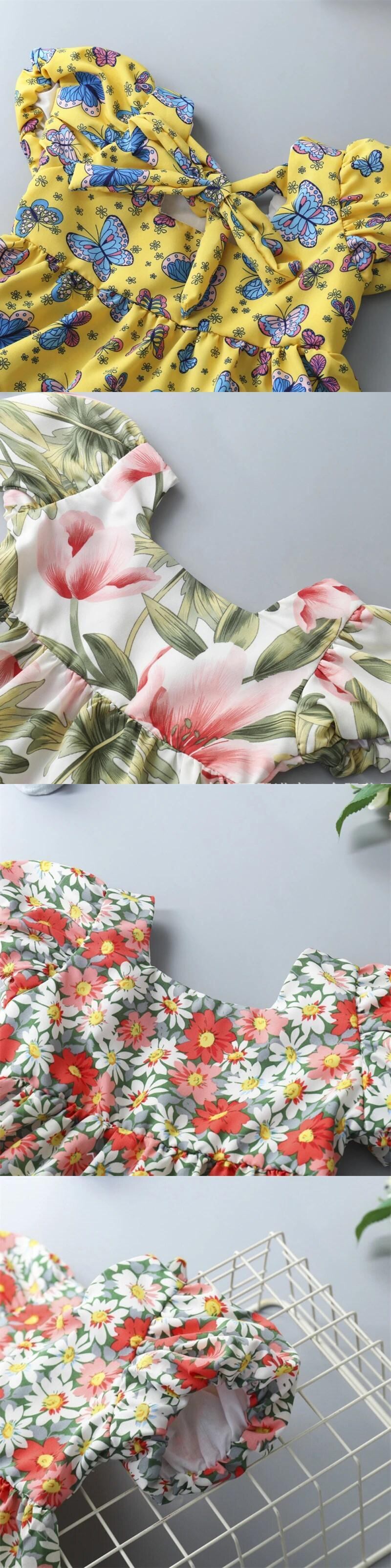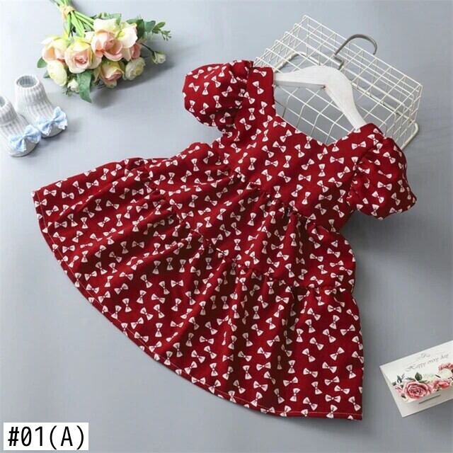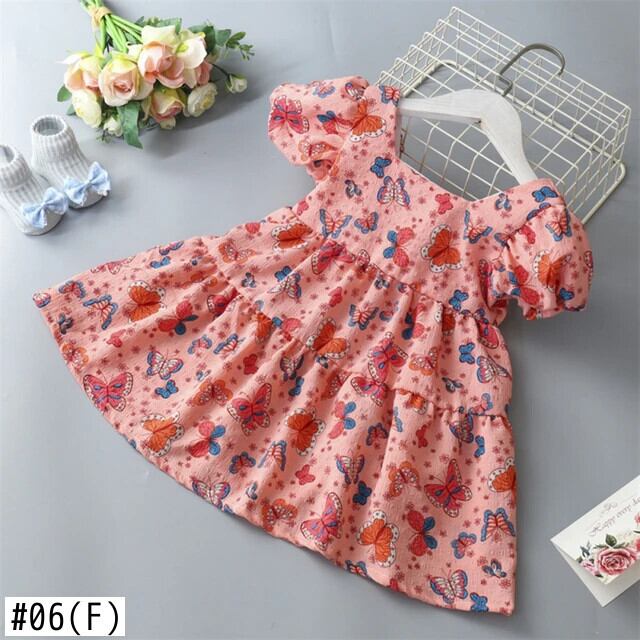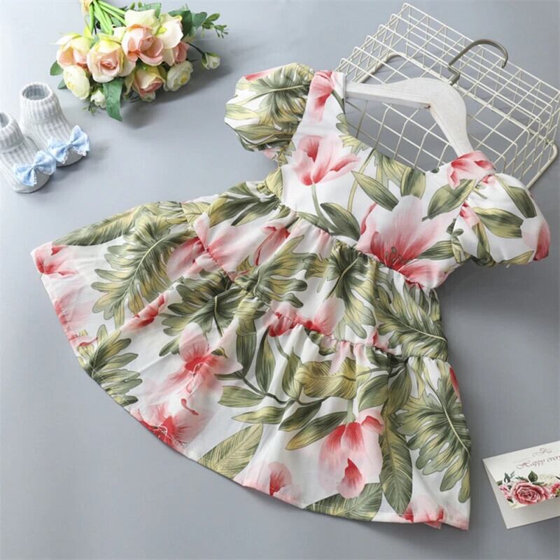 夏キッズ女子ドレスパフスリーブ女赤ちゃんフラワープリントちょう結びドレスガールドレス リボン サマー 夏物 フラワーデザイン