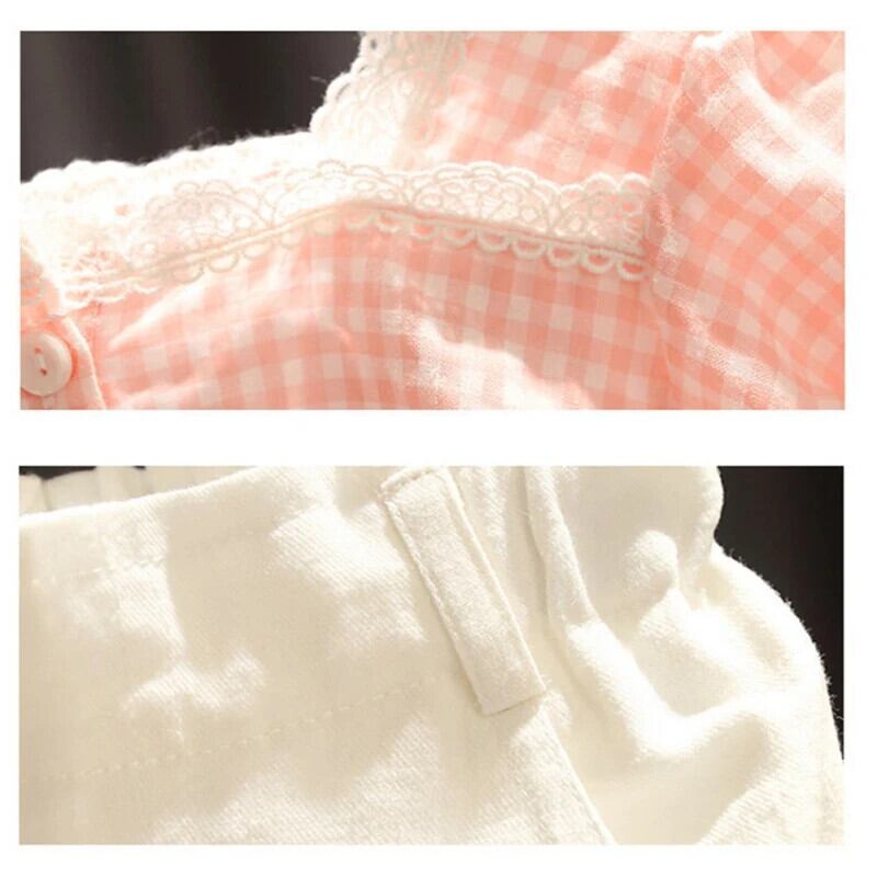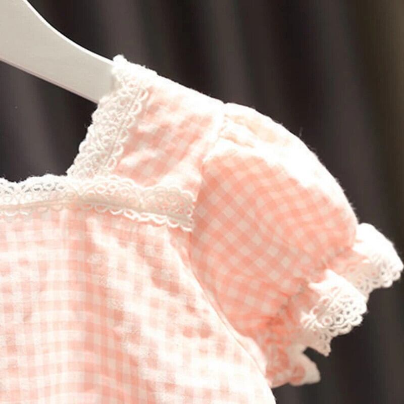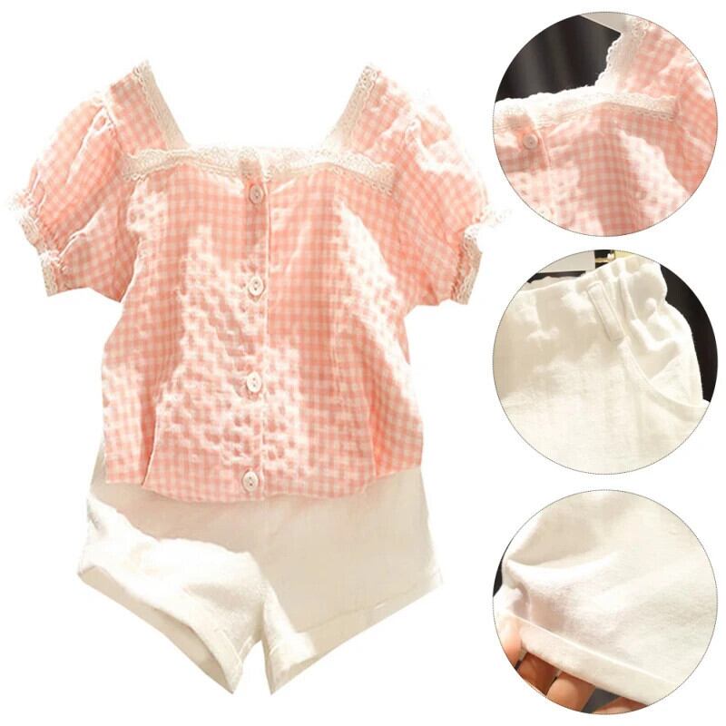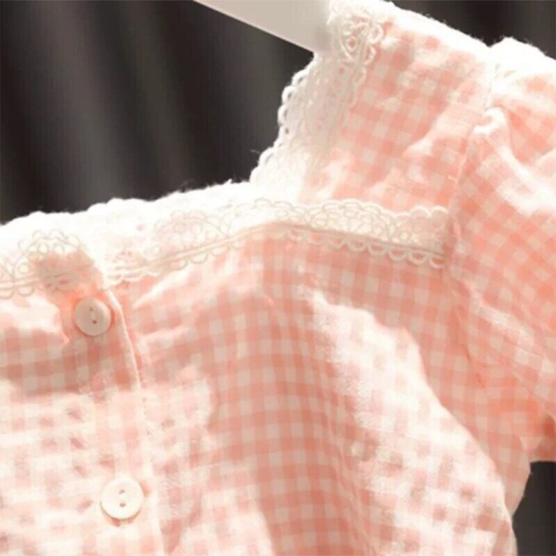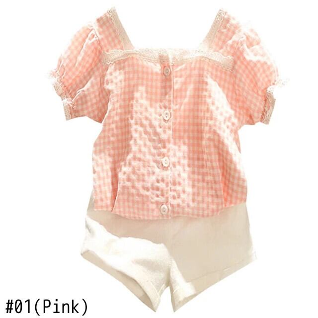 夏女赤ちゃんセットふわふわ半袖コットンシャツブラウス + ショートパンツ甘いチェック柄トップショーツ 2 個スーツ 1-4T ハーフスリーブ 大人ガーリー スウィート キュート カジュアル サマー 夏物 ブルマー | Princess